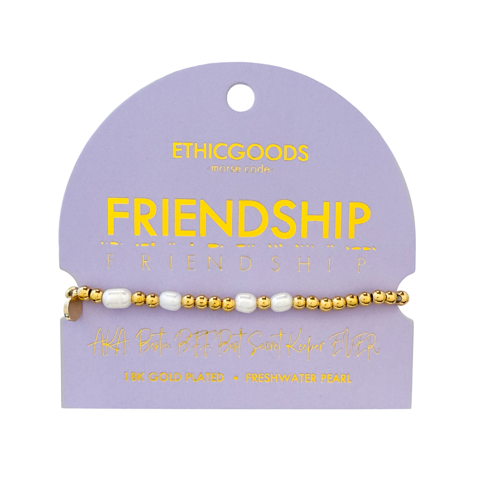 Each bracelet spells a word using a pattern of beads that stand for dots and dashes. The meaning is printed on the card so you can see what your bracelet says.