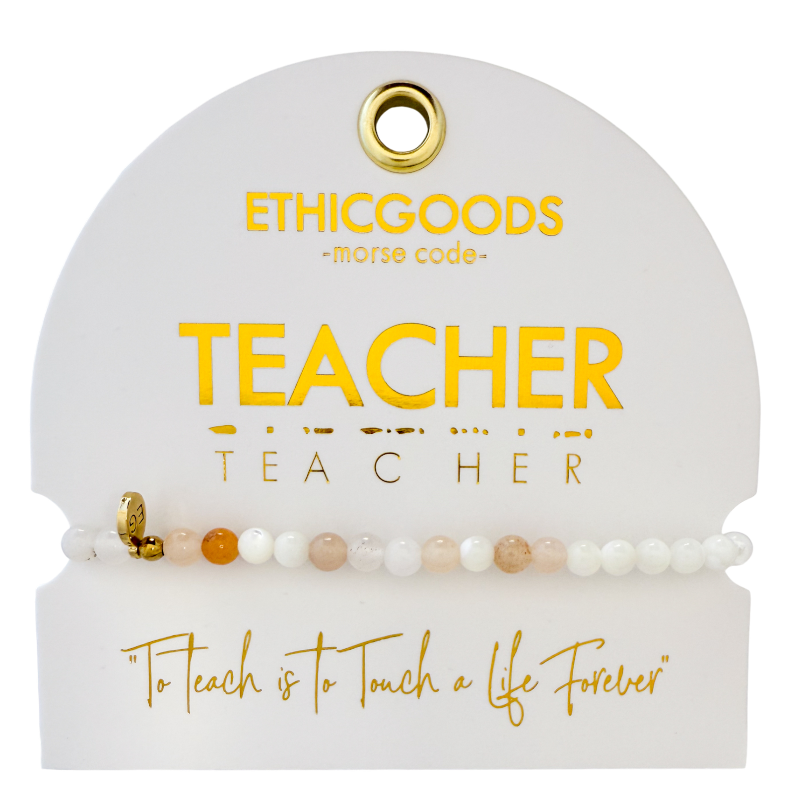 How to read your jewelry: A Morse Code dot is one bead and a dash is two beads in the alternating color. Start at the small gold spacer bead and follow the Morse Code spelling around the bracelet!