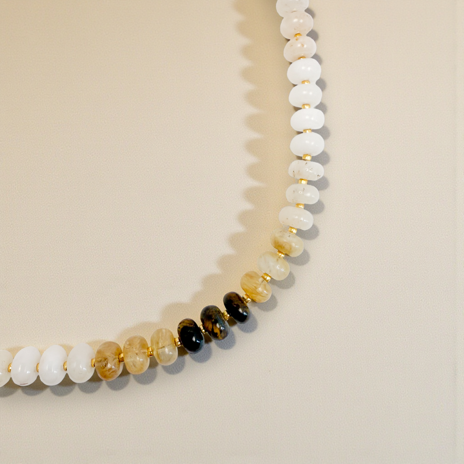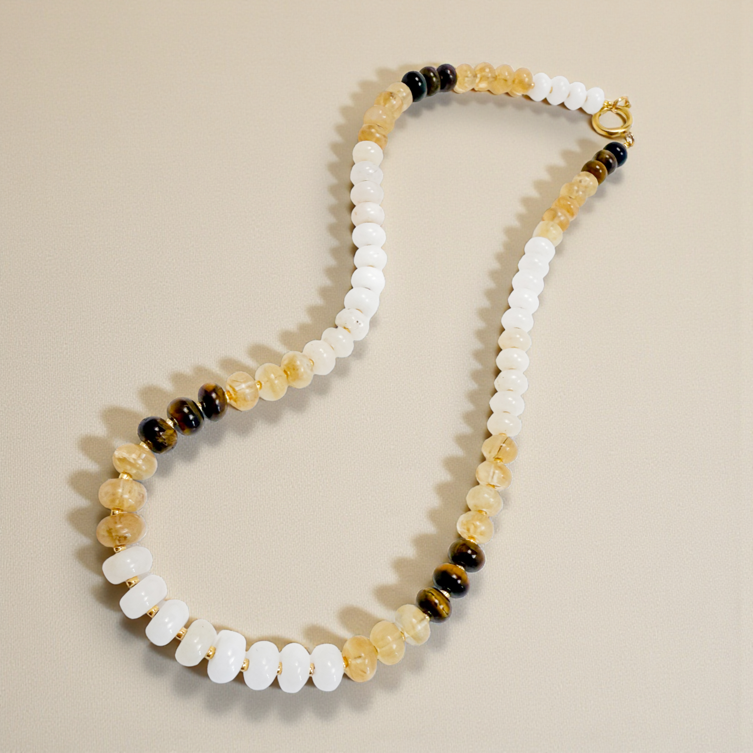 This necklace features 8mm natural gemstones including tiger’s eye, agate, and warm quartz tones. With layered earth shades of gold, amber, brown, and rust, it’s bold, rooted, and full of grounded energy.