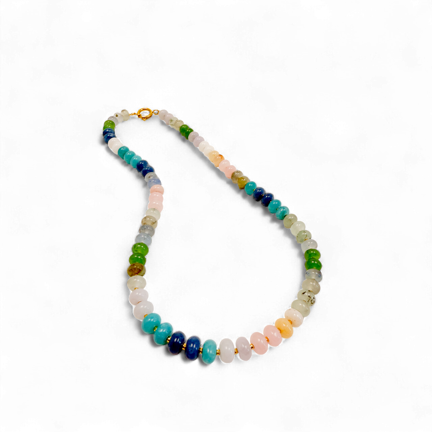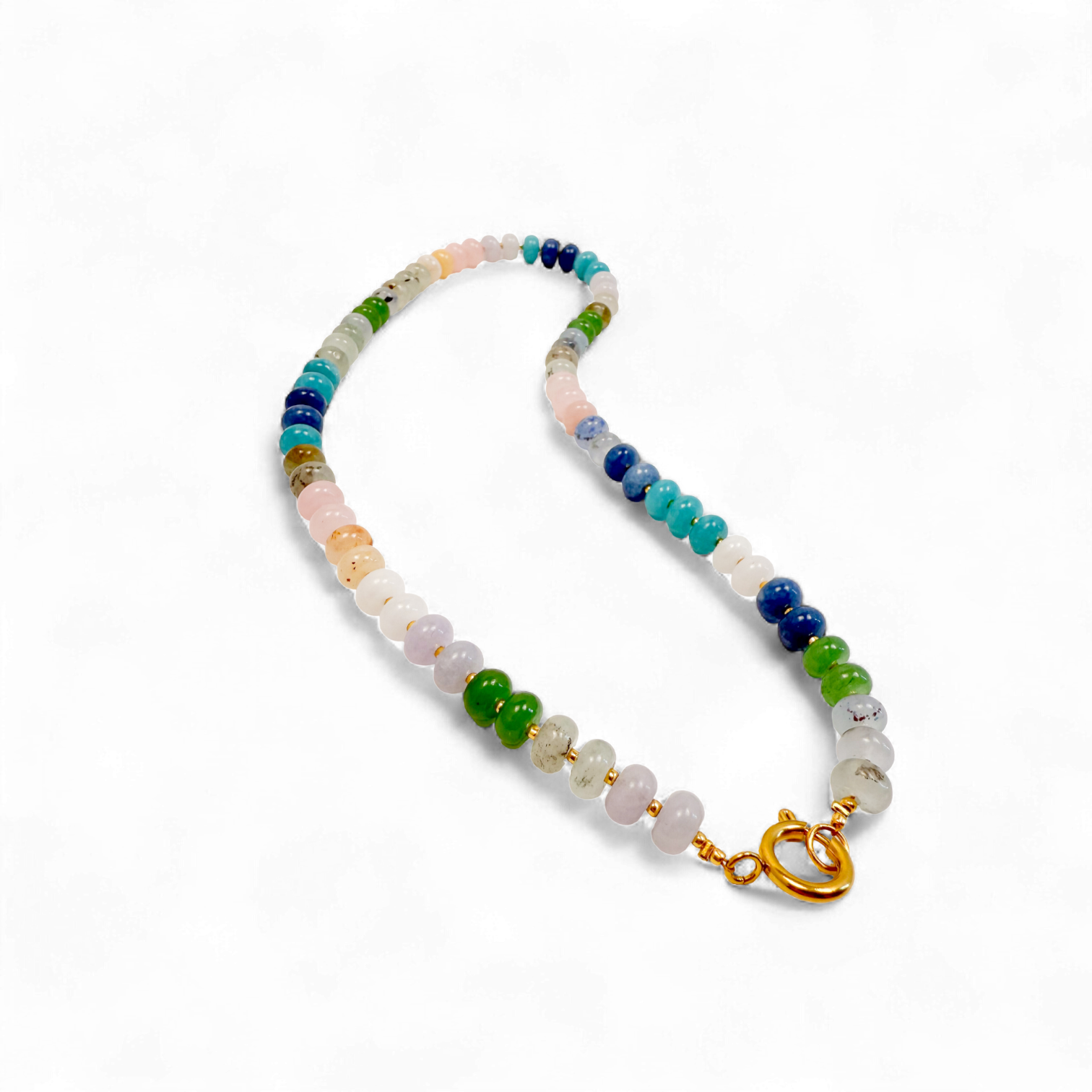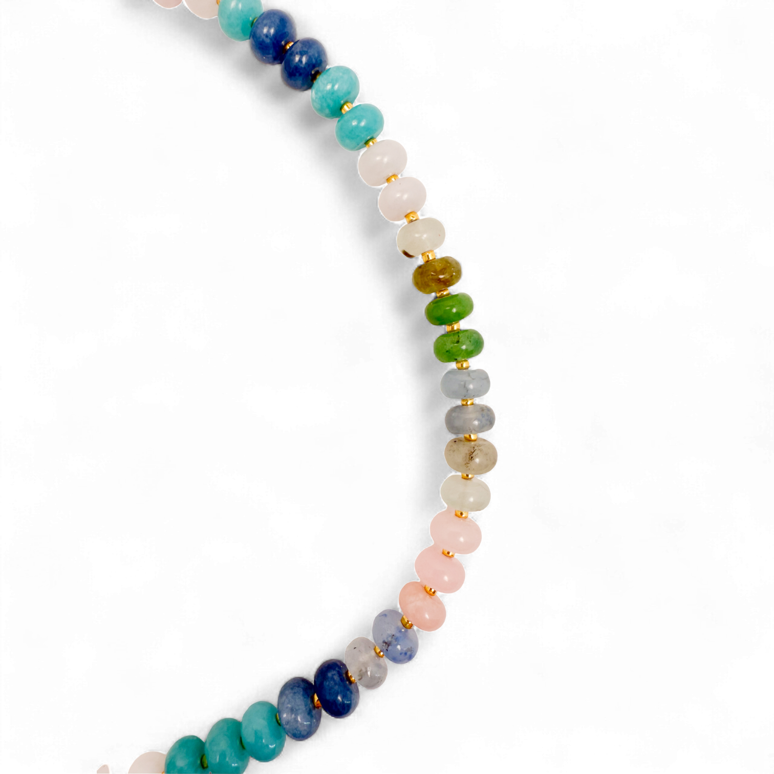 This necklace features 8mm natural gemstones in an upbeat mix of blue, pink, green, and white quartz. Bright and playful but still polished, it’s made for color lovers who want to add energy to their everyday style.