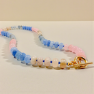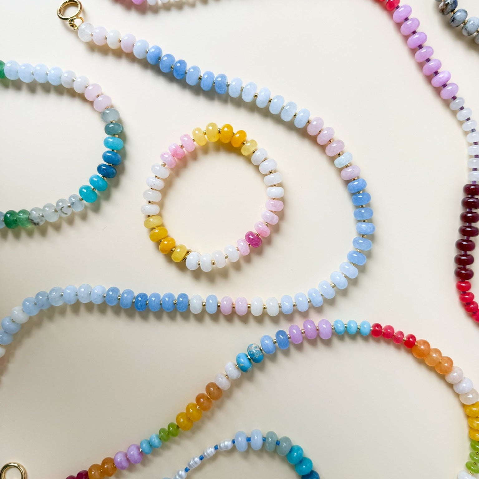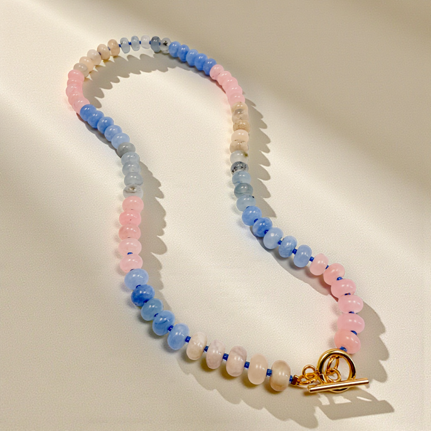 This necklace features 8mm rondelle beads of blue, white, and pink quartz, offering soft, grounding energy in a bold, confident silhouette. The gentle gradient of color feels like sunrise over still water—calming, fresh, and full of possibility.