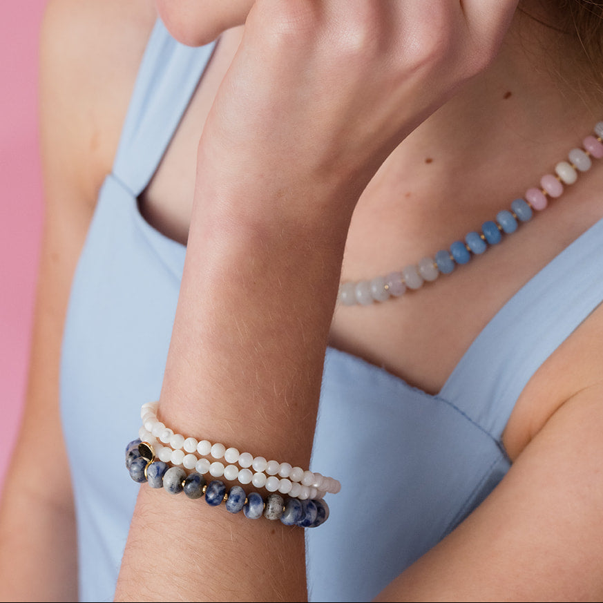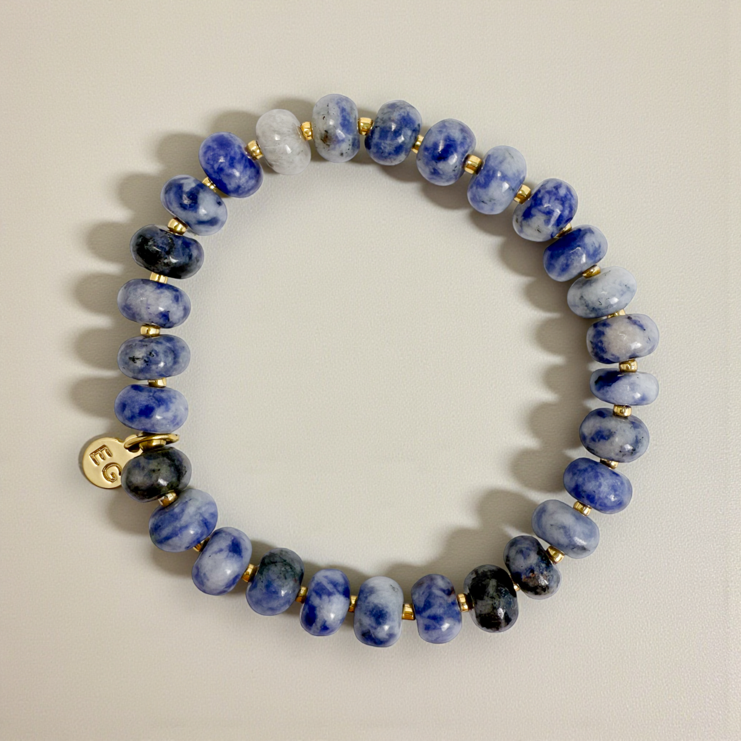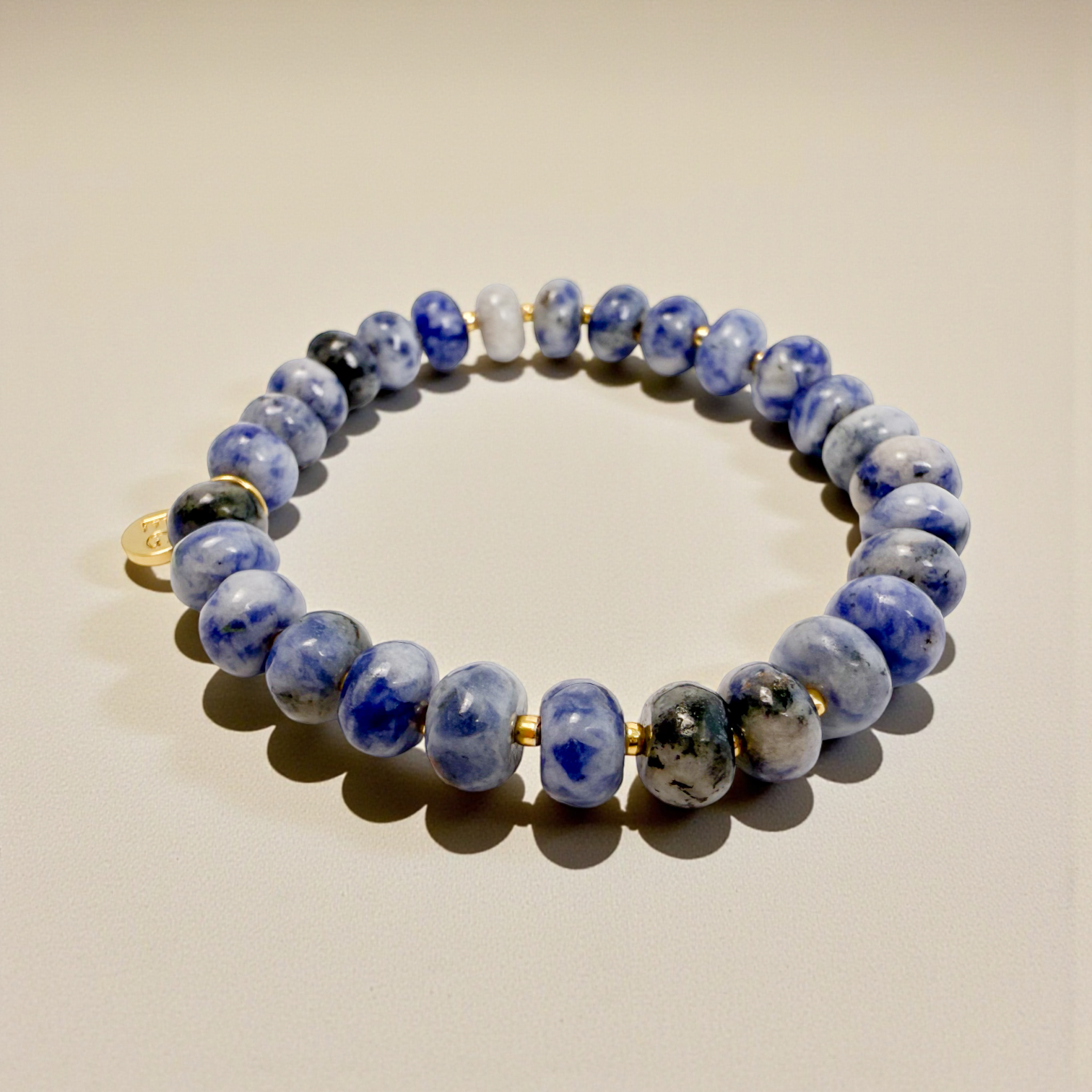 This bracelet features 8mm natural Lapis Lazuli rondelle beads known for their rich deep blue color and golden flecks. Long associated with wisdom, confidence, and truth, Lapis is a stone that empowers from within. Striking yet versatile, this bracelet brings bold meaning to your everyday style.
