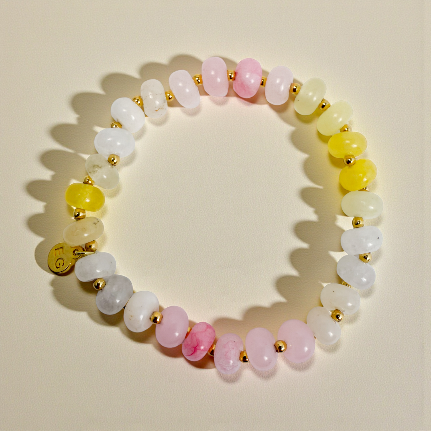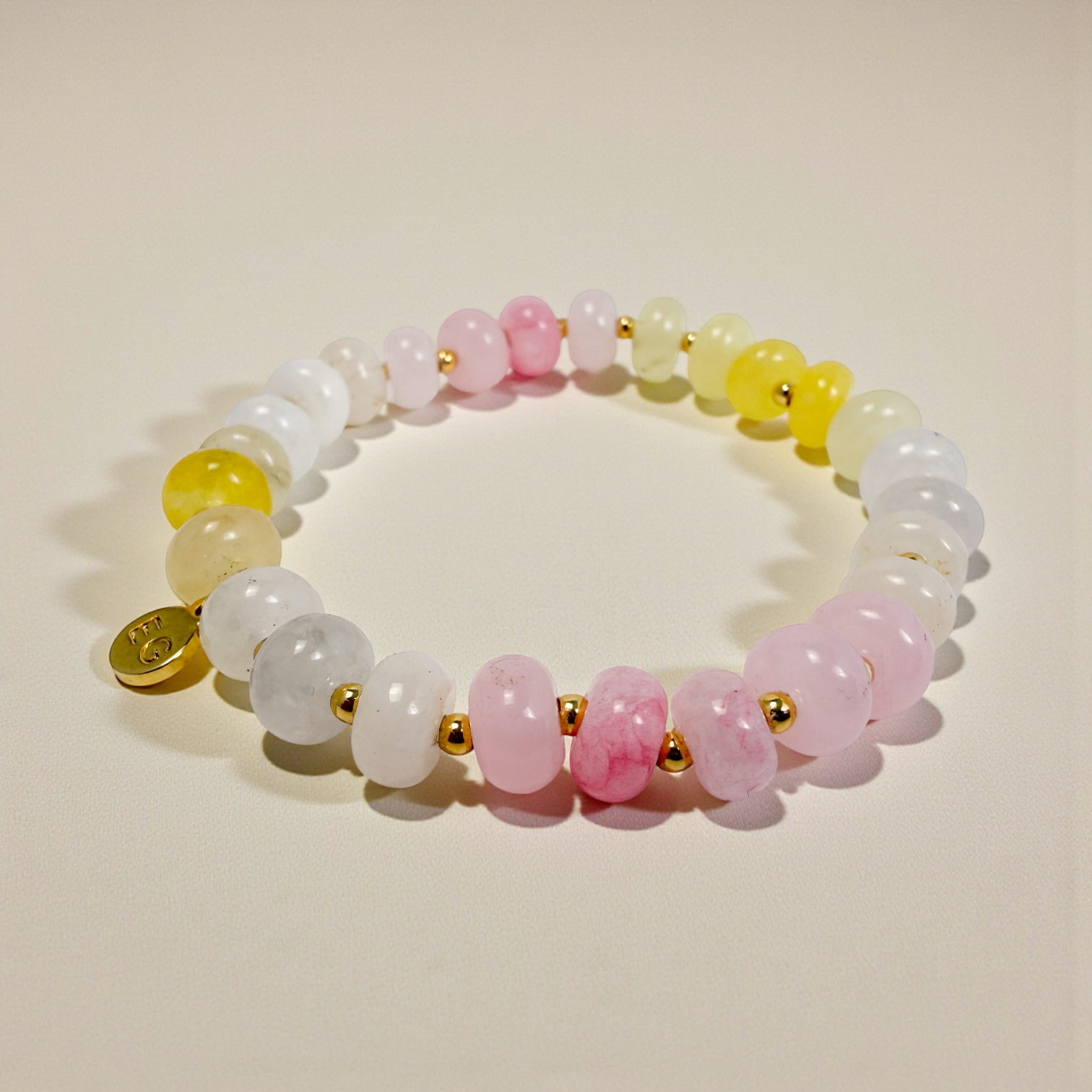 This bracelet features 8mm Pink Lemonade gemstone rondelle beads in playful shades of coral, pink, and blush. Bright, cheerful, and full of energy, this bracelet is your daily boost of joy and creativity. A feel-good piece that’s easy to wear.