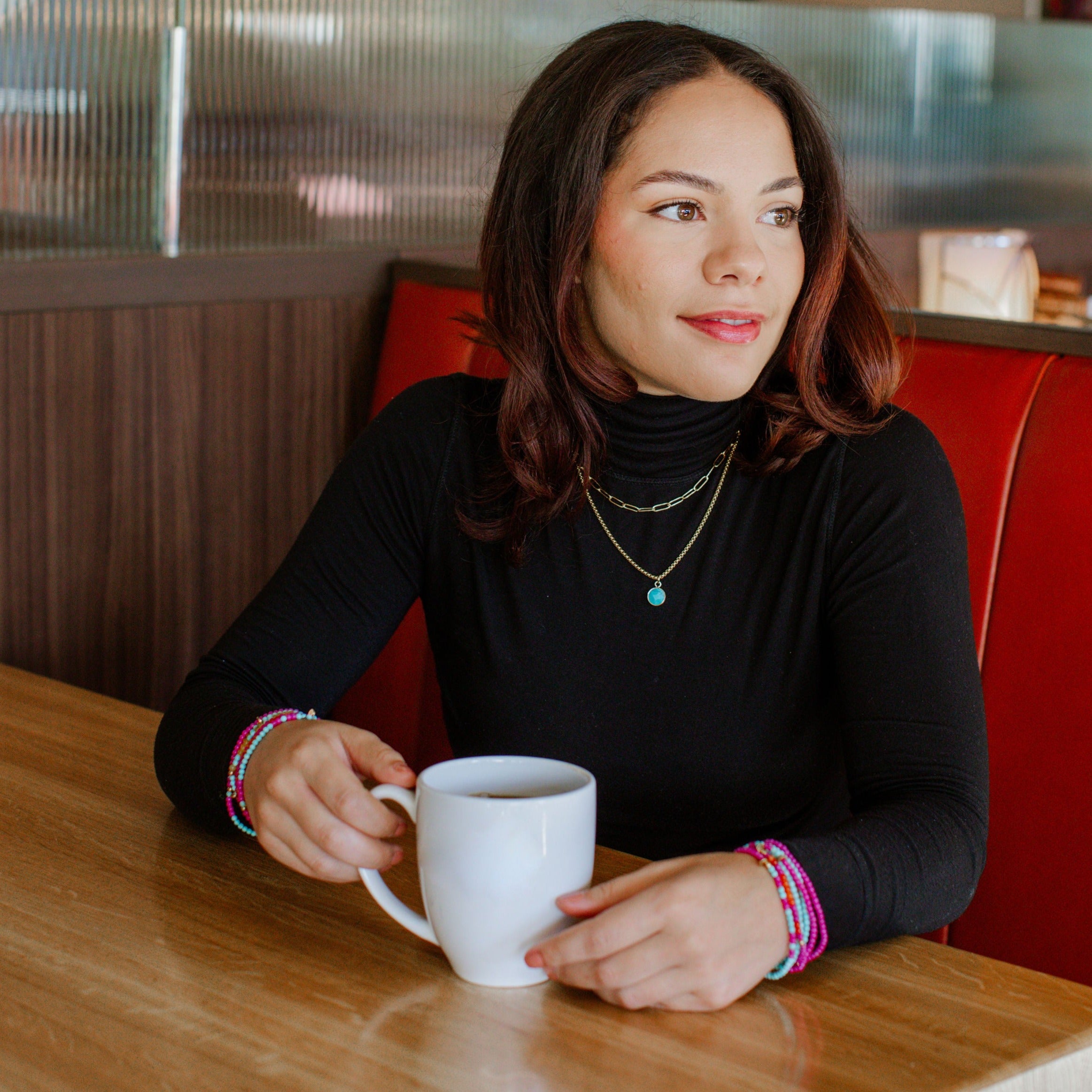 - Made with semi-precious stones, hematite, glass beads, and elastic