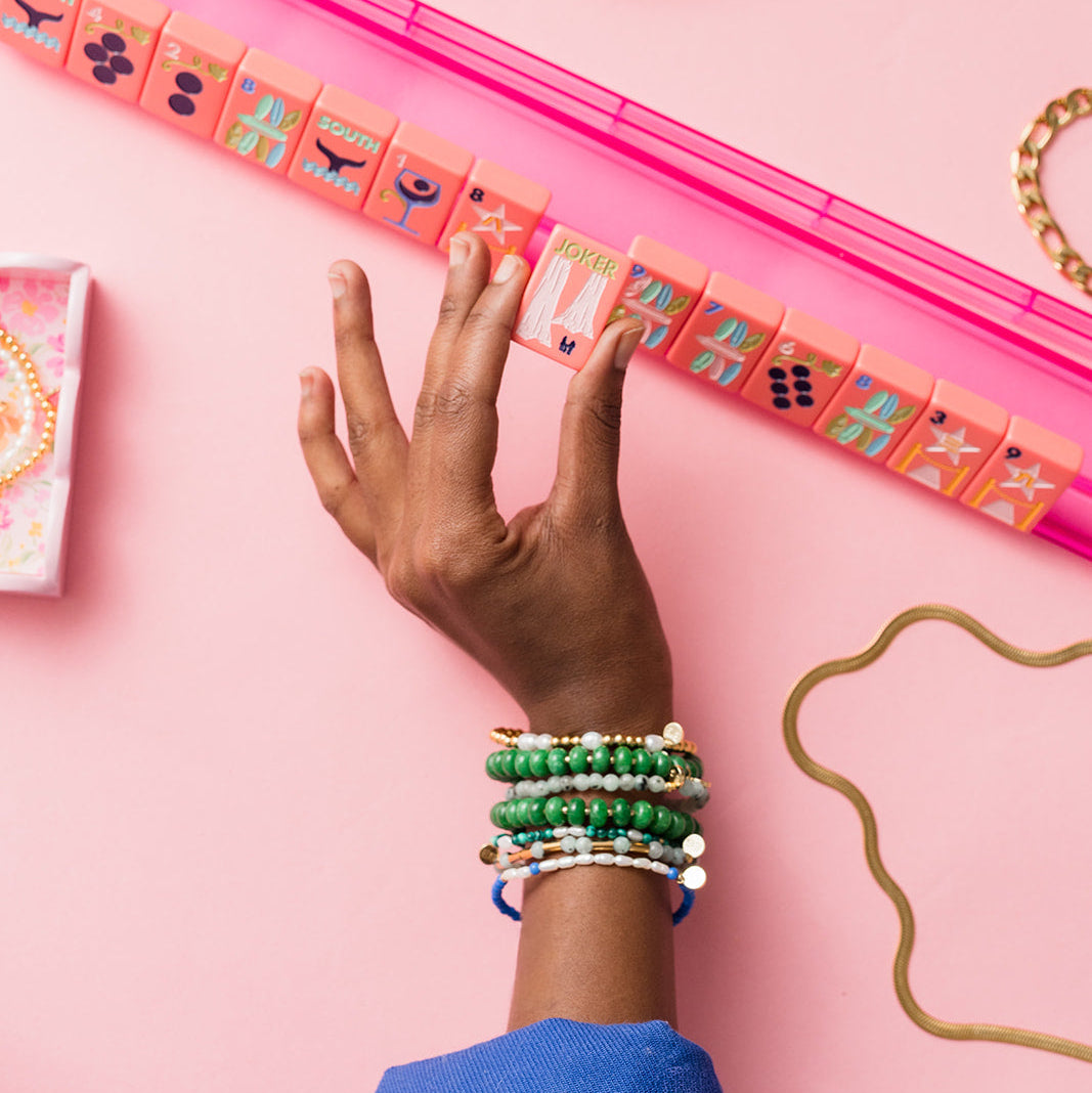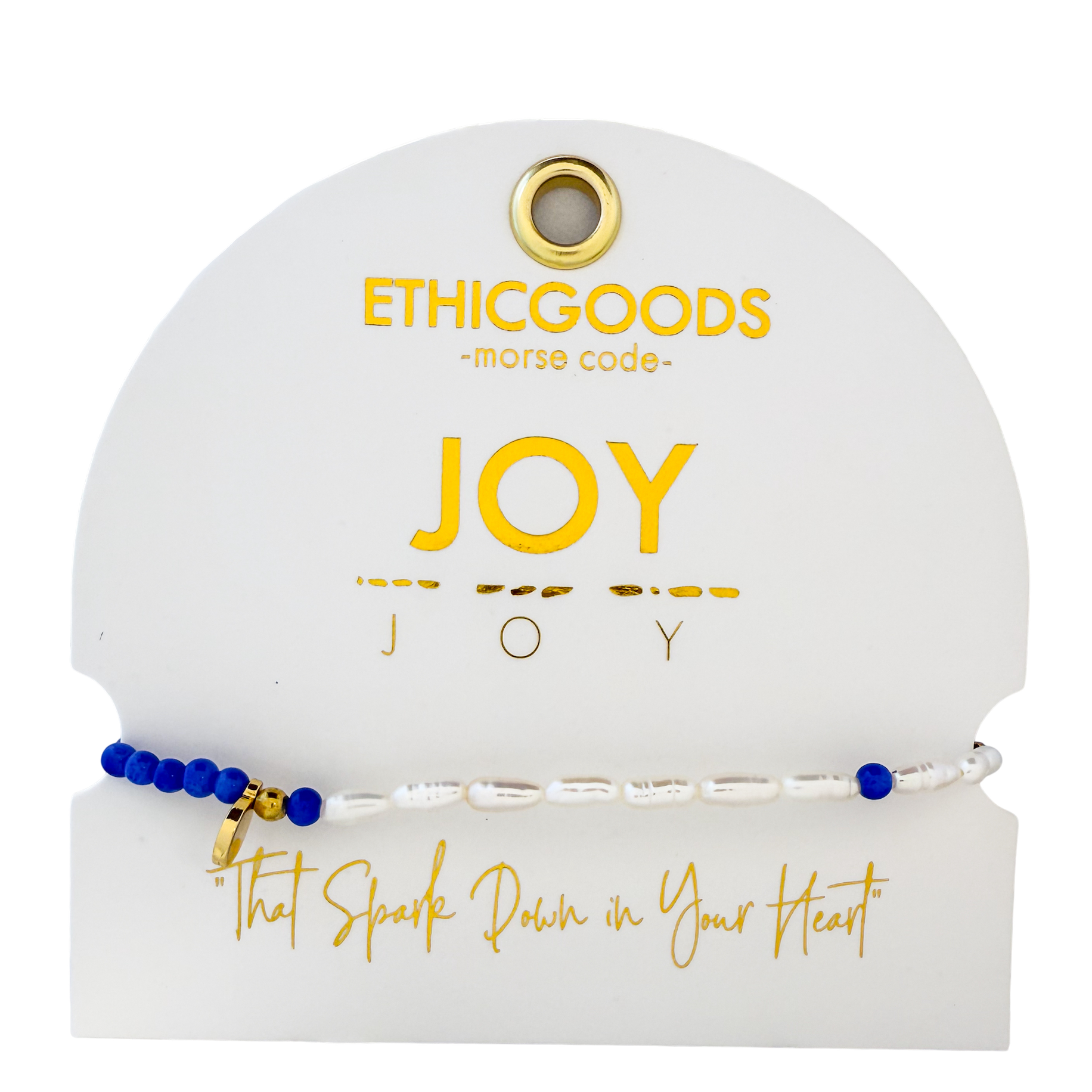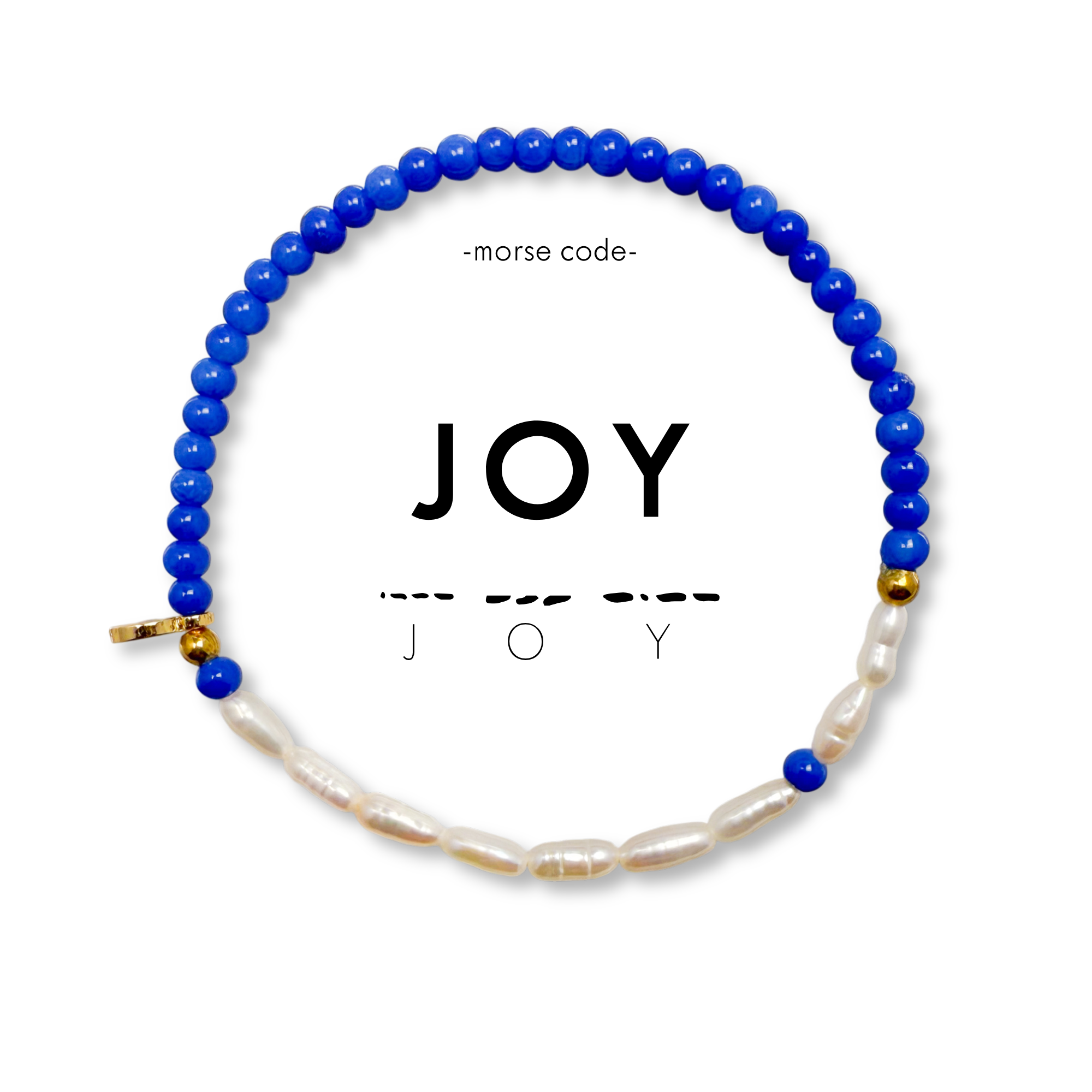 This bracelet spells JOY in Morse Code using 3mm semi-precious stones and freshwater pearls. A cheerful reminder to look for the good, embrace the moment, and lean into gratitude.