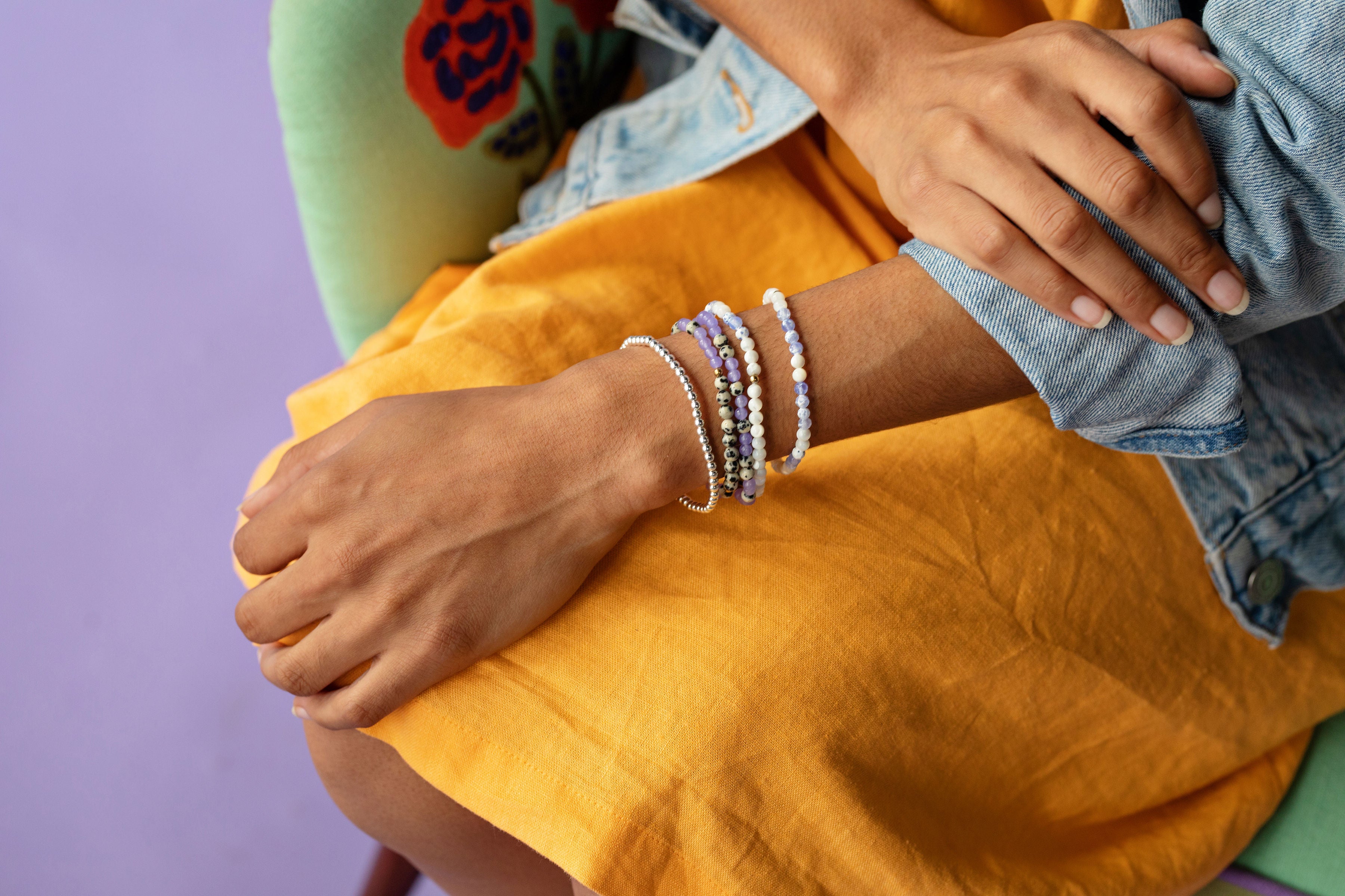 - Made with semi-precious stones, hematite, glass beads, and elastic.