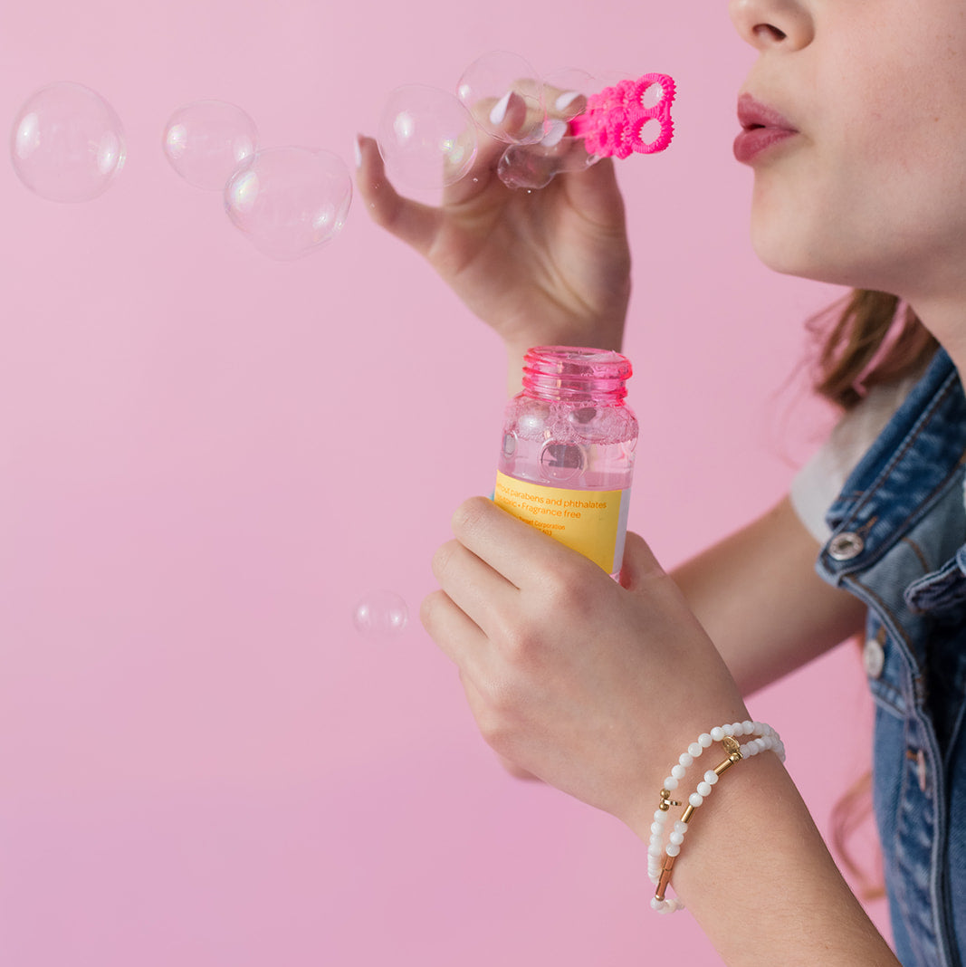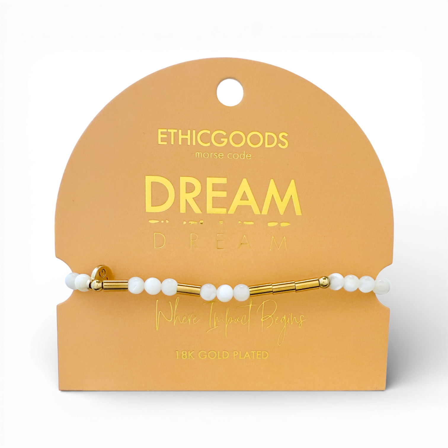 This bracelet spells DREAM in Morse Code using 4mm semi-precious stones and gold PVD tube beads. A gentle nudge to imagine freely and pursue what pulls at your heart.