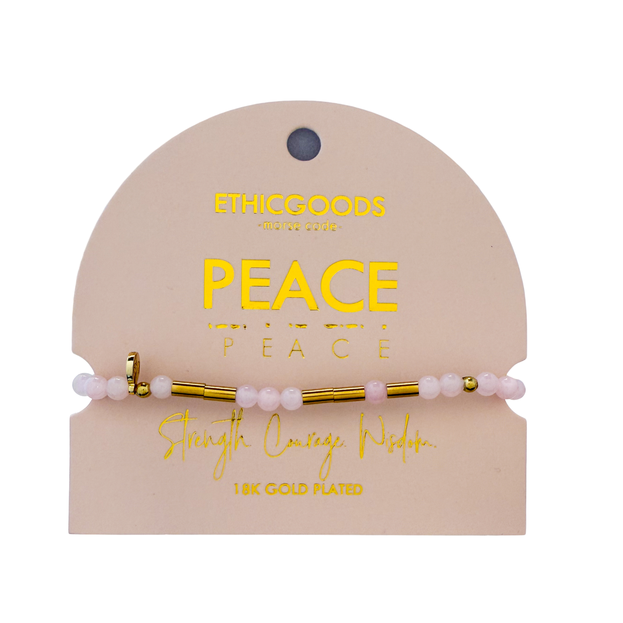 This bracelet spells PEACE in Morse Code using 4mm semi-precious stones and gold PVD tube beads. A grounding reminder to breathe deeply, center yourself, and choose serenity.