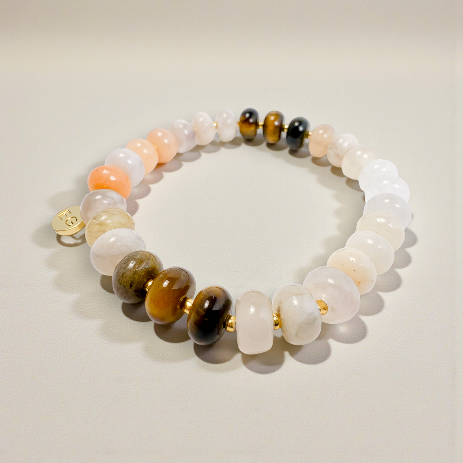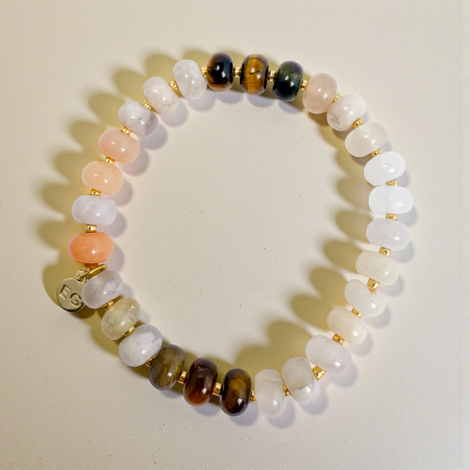This bracelet features 8mm Sahara-colored gemstone rondelle beads with warm, neutral tones reminiscent of desert landscapes. Designed to ground and center your energy while adding effortless style to your stack, Sahara is understated and endlessly wearable.