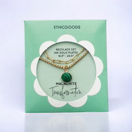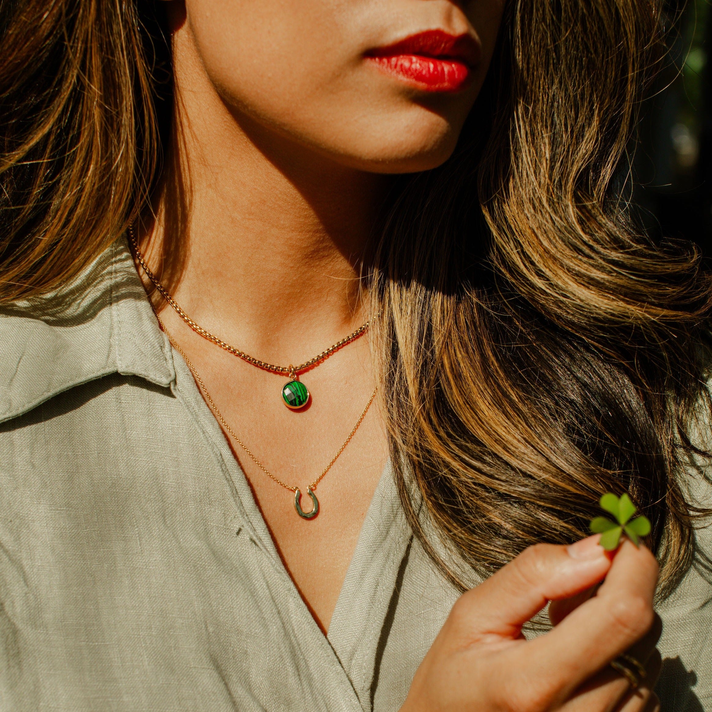 Introducing our beautiful and timeless collection of 14k Gold Plated semi-precious Malachite stone pendant necklace set! Designed to be waterproof, these pieces add the perfect touch of style and sophistication on a rolo chain - measuring 18.5-20.5" with a 2" extender.