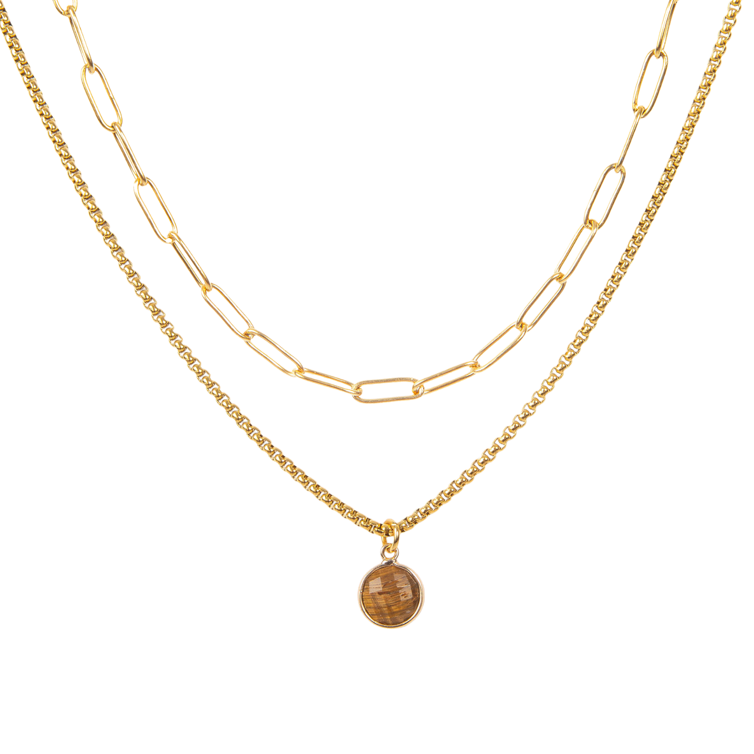 Classic Gold Stone Pendant Necklace Set - Paperclip Chain & Tiger's Eye
