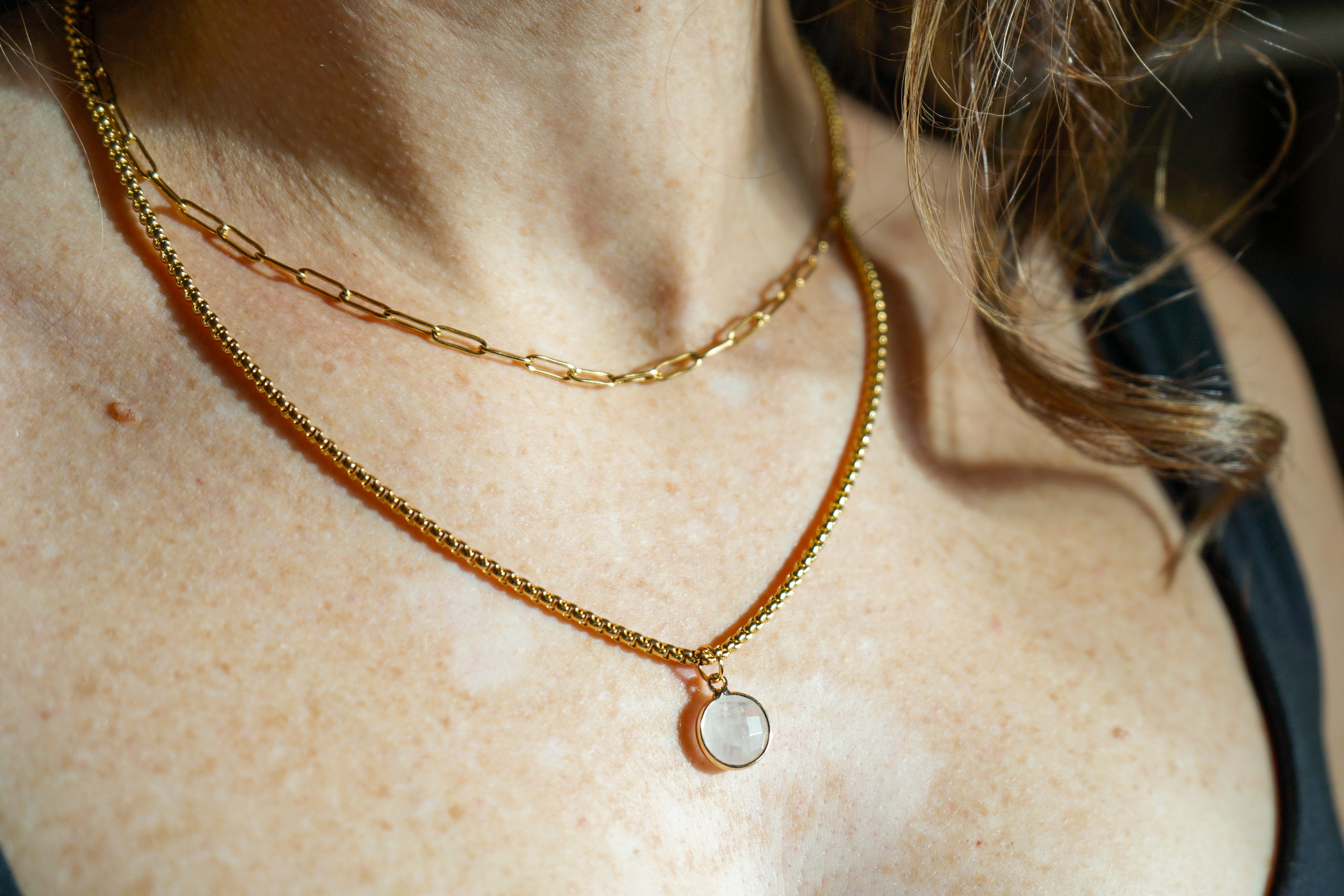 Introducing our beautiful and timeless collection of 14k Gold Plated semi-precious White Quartz stone pendant necklace set! Designed to be waterproof, these pieces add the perfect touch of style and sophistication on a rolo chain - measuring 18.5-20.5" with a 2" extender.