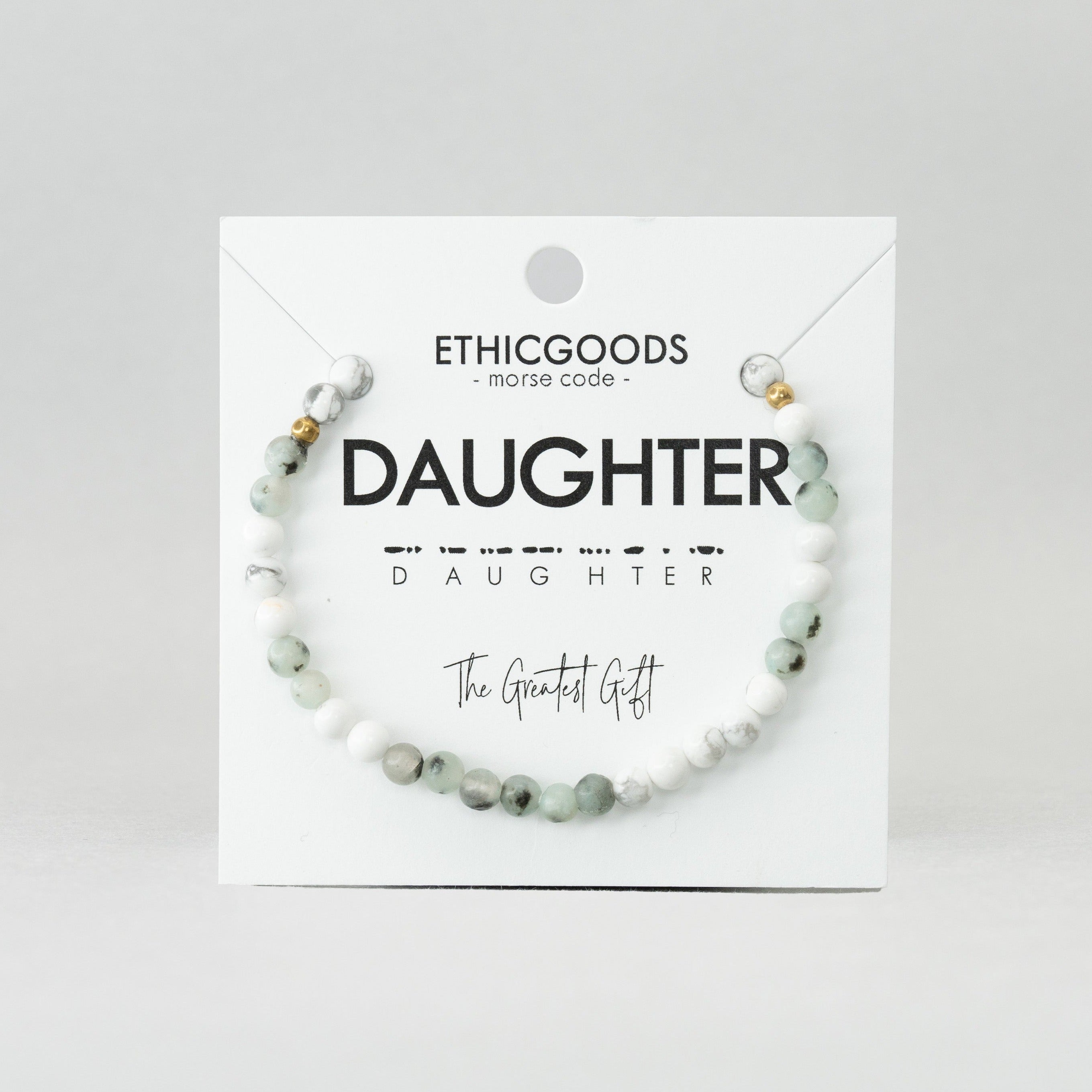 How to read your jewelry: A Morse Code dot is one bead and a dash is two beads in the alternating color. Start at the small gold spacer bead and follow the Morse Code spelling around the bracelet!