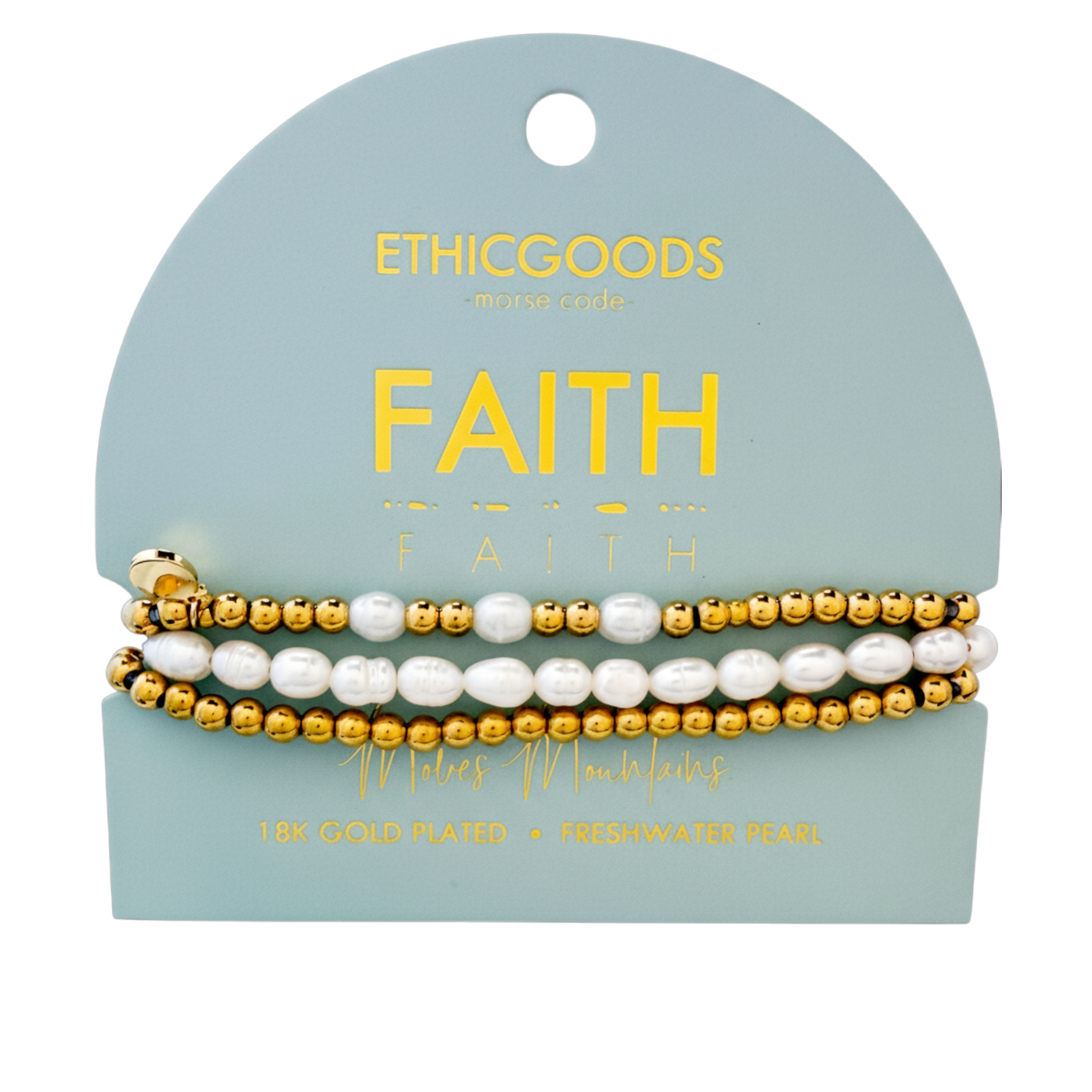 This stacking set encodes FAITH in Morse Code using freshwater pearls and waterproof gold PVD beads.