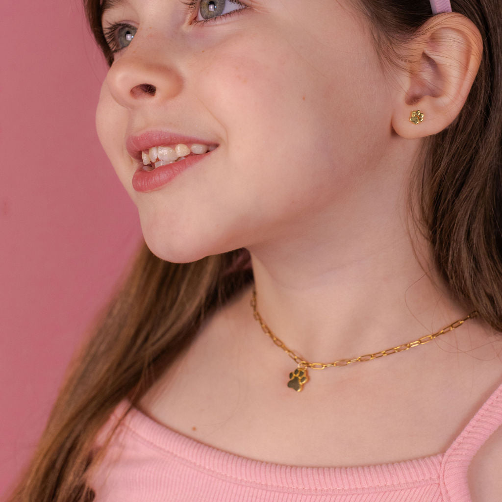 Get your mini-me ready to accessorize with our Kid's Necklace and Earring Set, inspired by their love for animals! The 14K Gold plated set features a darling Paw print pendant necklace and earring studs with flat back and hypoallergenic screw-on earrings, making it perfect for adorably stylish animal lovers.