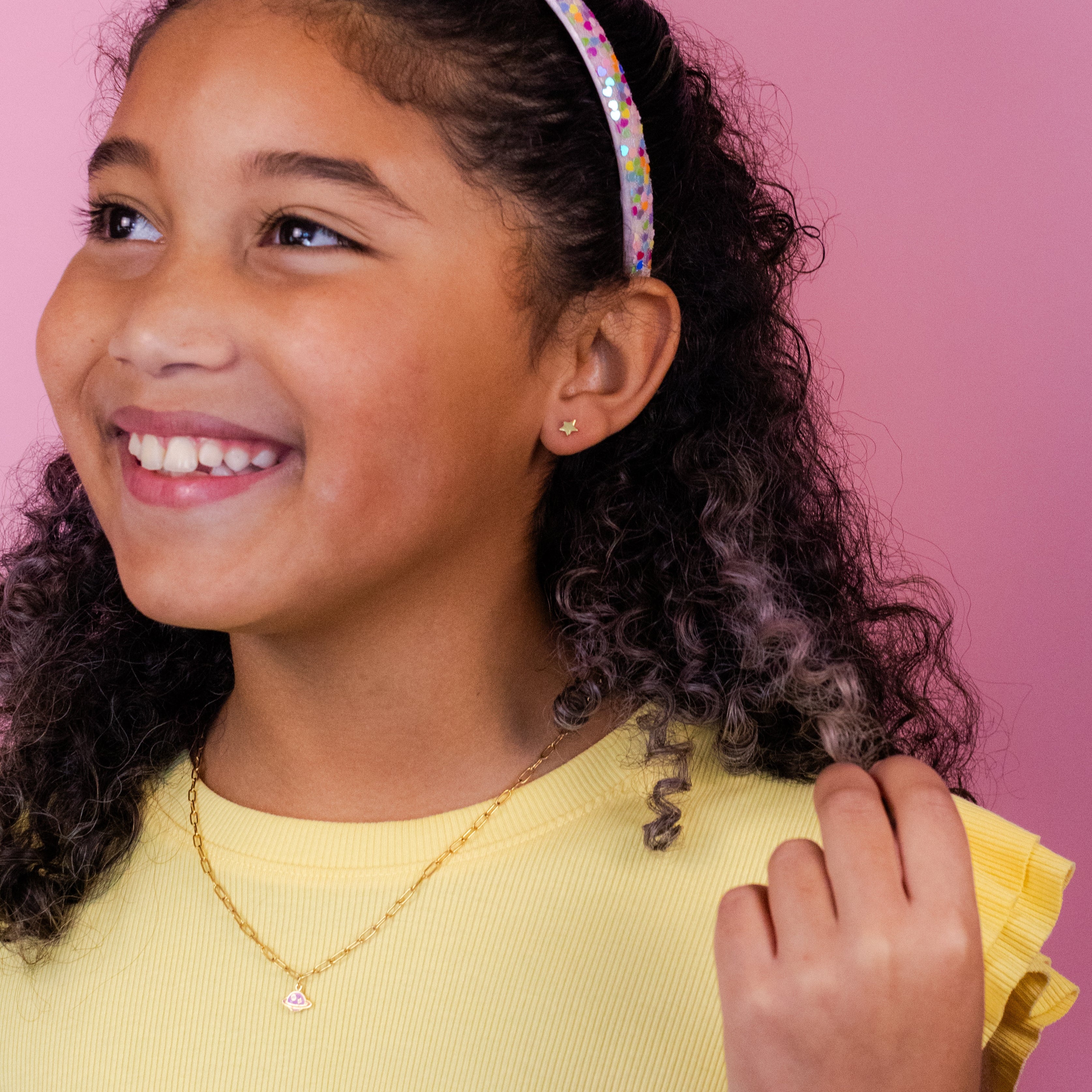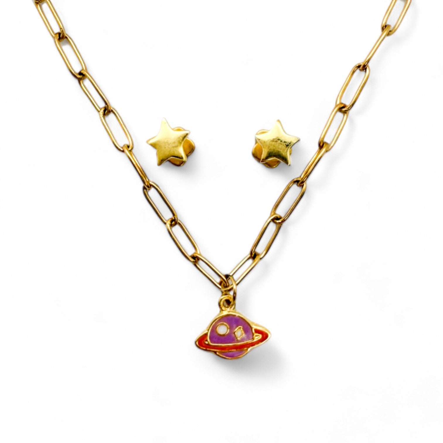 Your little one will reach for the stars with this fun and out of this world Kid's Necklace and Earring Set. Featuring a charming paperclip chain with a Saturn pendant and star micro studs, both 14K Gold plated and water resistant, this coordinating set is perfect for any adventure. Hypoallergenic and easy to wear with flat back and screw on design. Endless possibilities await!