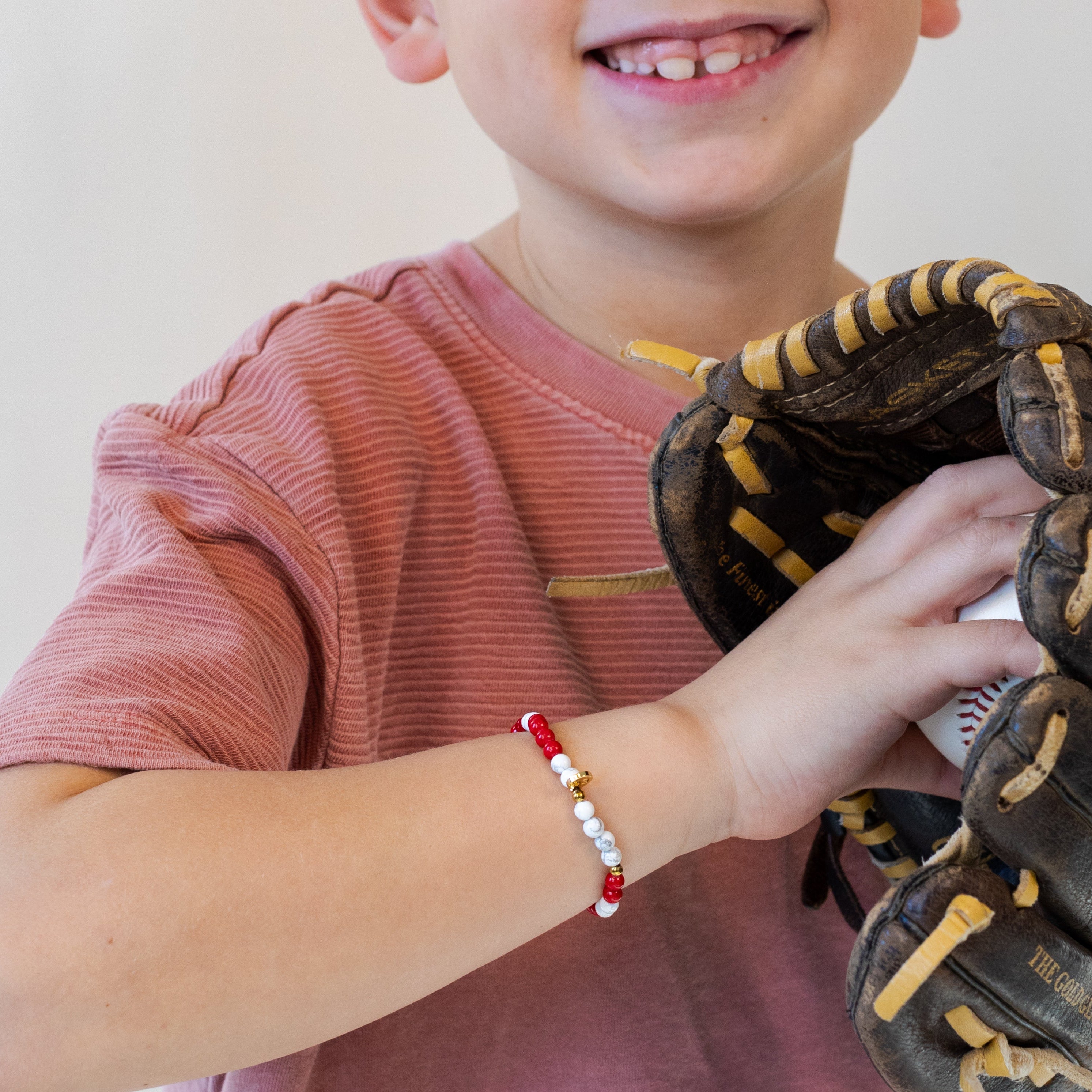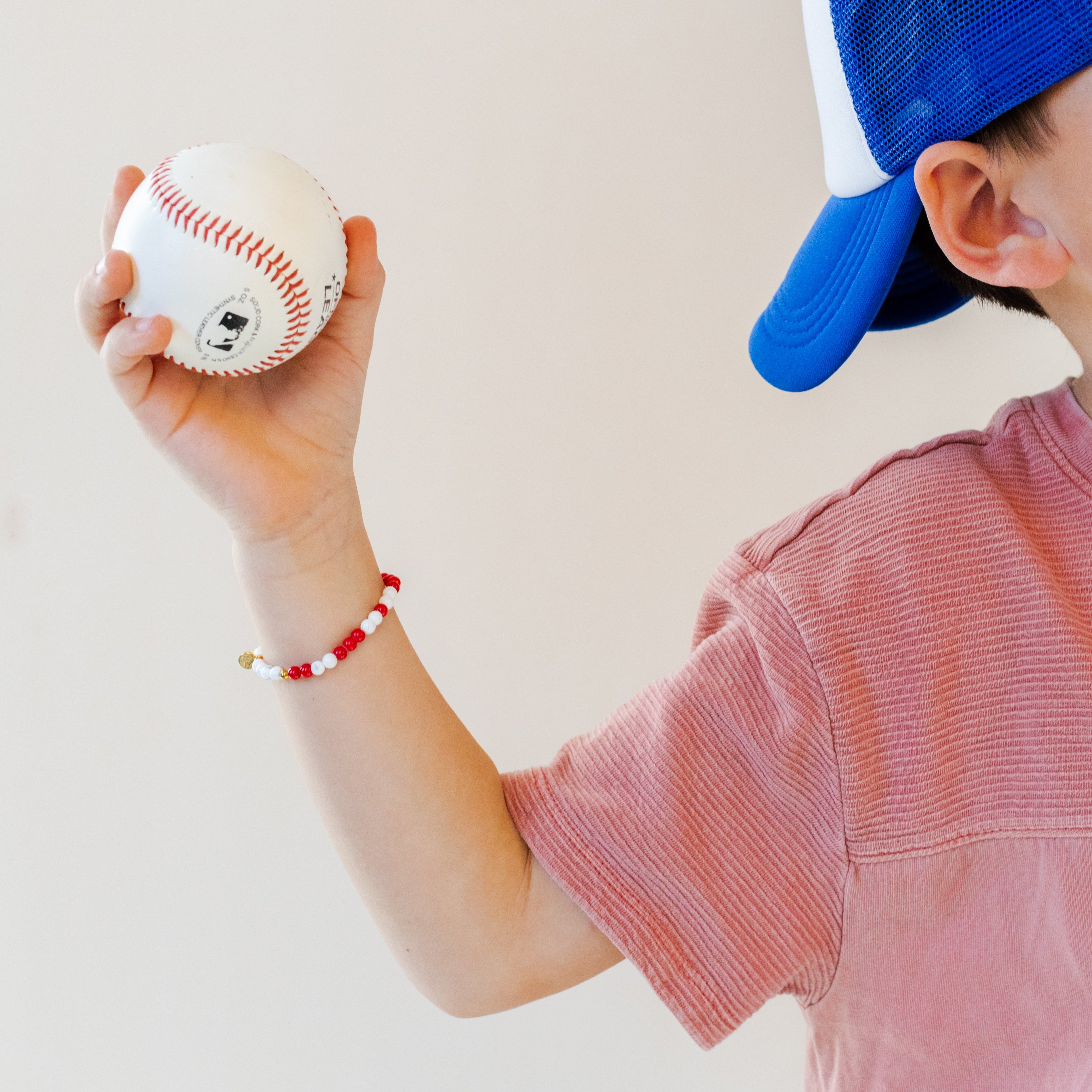 Play Ball! Score a home run with this playful Morse Code bracelet featuring red and white beads that spell out "Baseball" in Morse Code. Perfect for any baseball fan, this accessory is a fun way to show your love for America's pastime.