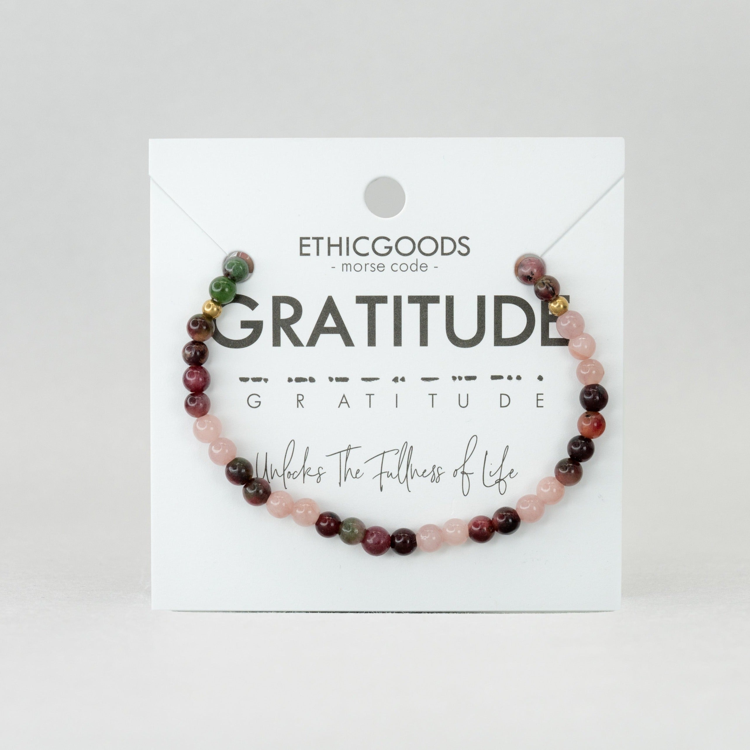 How to read your jewelry: A Morse Code dot is one bead and a dash is two beads in the alternating color. Start at the small gold spacer bead and follow the Morse Code spelling around the bracelet!
