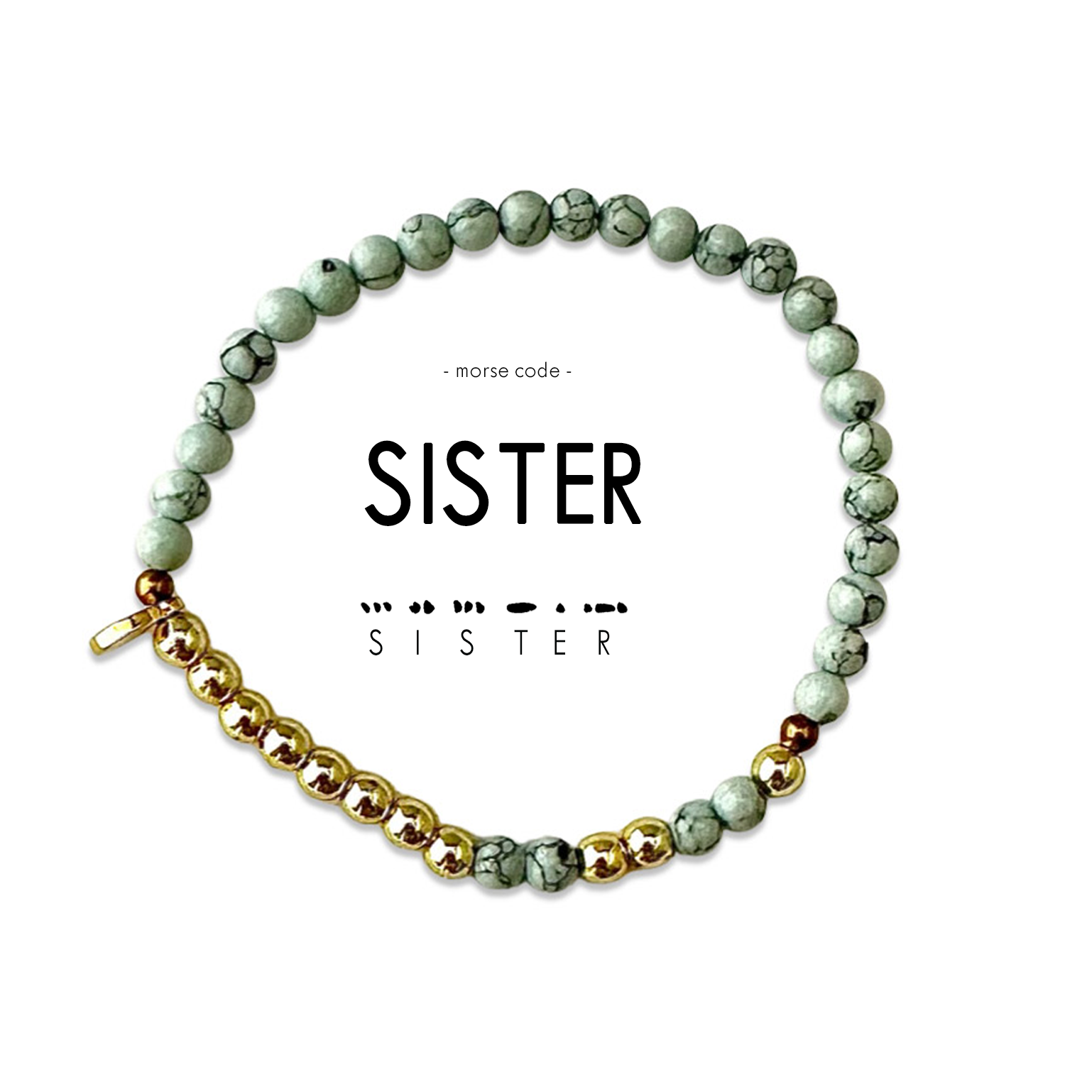 One SISTER Morse Code Bracelet, one gold hematite bracelet, one solid stone stacking bracelet. The perfect stacking set!