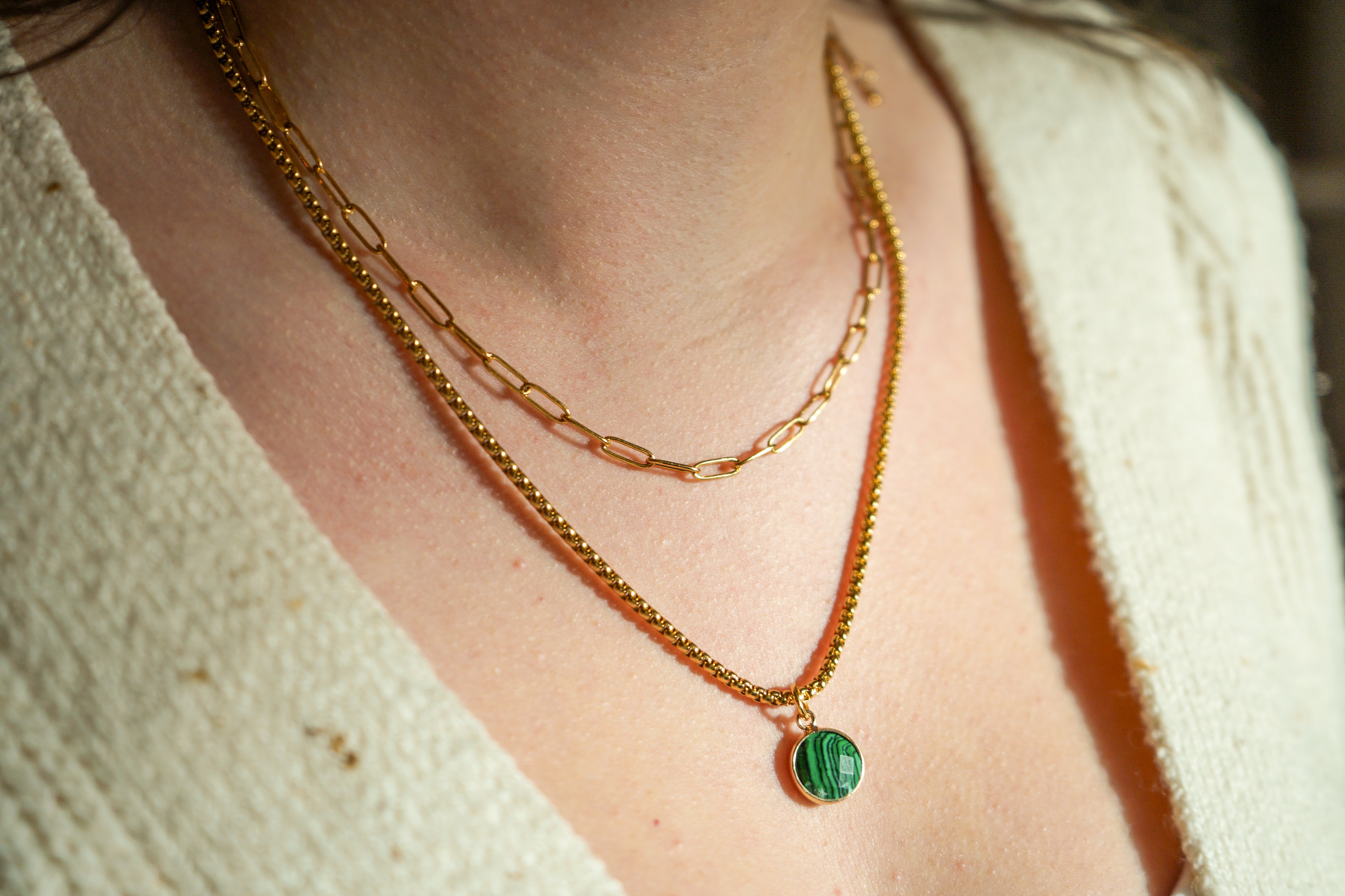 Paperclip Chain & Malachite Classic Gold Stone Pendant Necklace Set - Paperclip Chain & Malachite