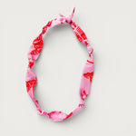 This scarf necklace showcases bright red lobsters on a playful pink backdrop. It’s a whimsical nod to seaside summers and laid-back elegance—perfect for channeling beach-day vibes anytime, anywhere.