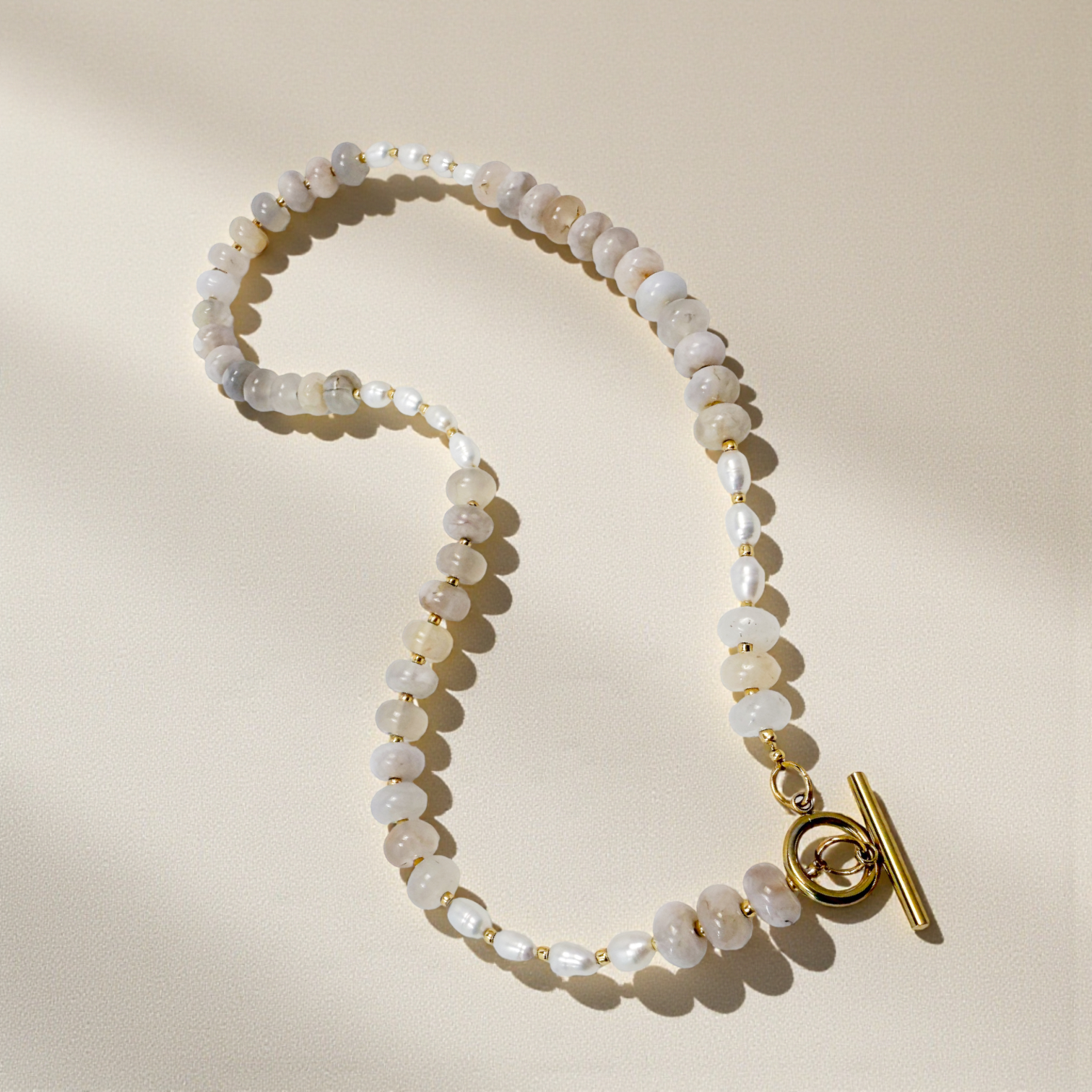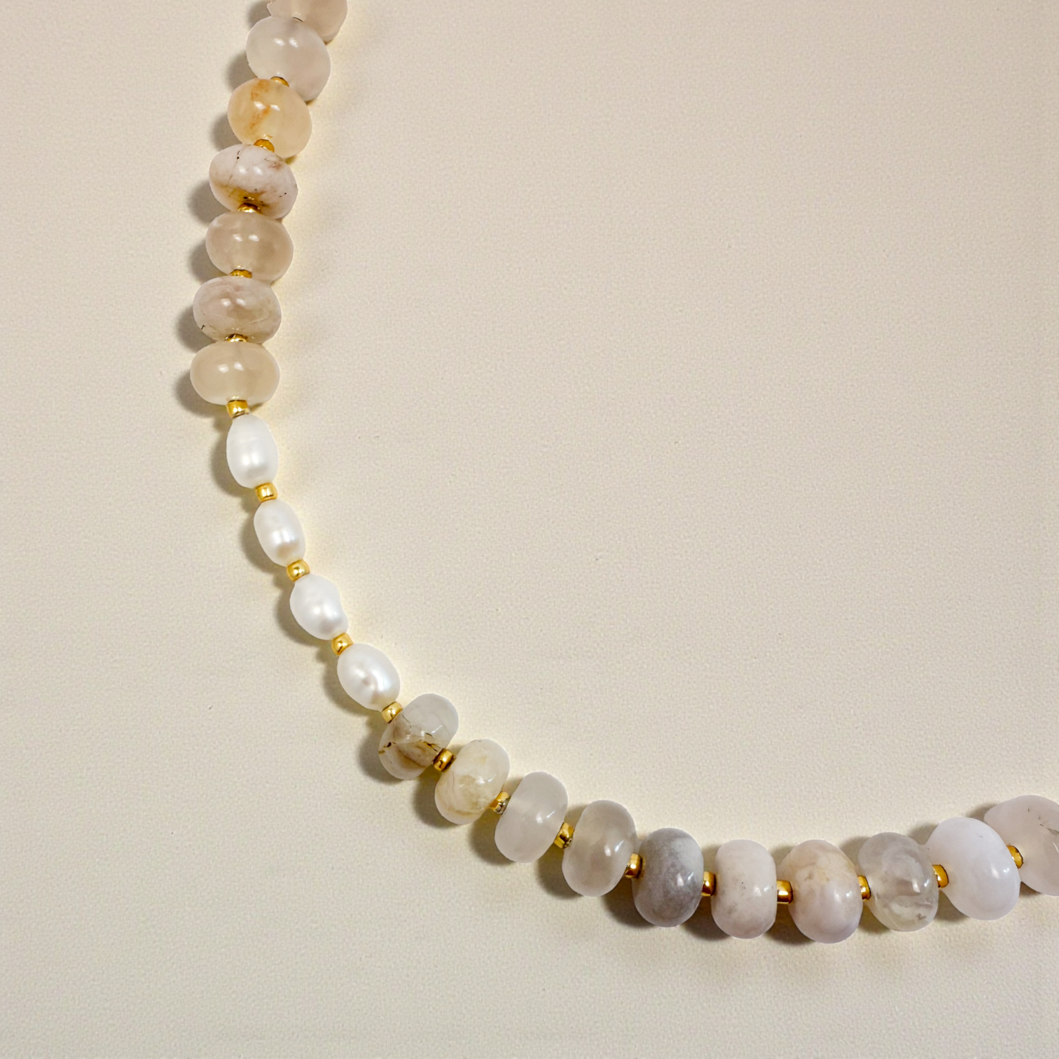 This necklace features a calming mix of neutral-toned agate gemstones and luminous freshwater pearls. The soft, natural palette evokes foggy mornings and quiet moments, offering both grounding and grace. It’s effortless, elegant, and full of depth.