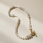 The gold-plated stainless steel toggle clasp is tarnish-resistant and waterproof, but for best longevity, remove before applying lotion, perfume, or sunscreen. Avoid swimming in chlorinated pools or saltwater while wearing your necklace to maintain the finish of both the clasp and the stones.