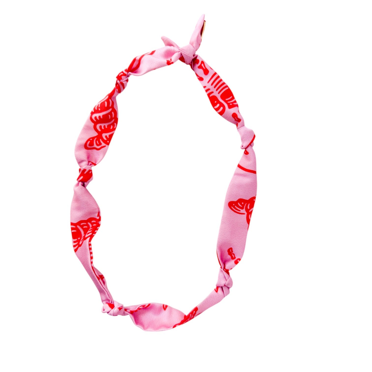 This scarf necklace showcases bright red lobsters on a playful pink backdrop. It’s a whimsical nod to seaside summers and laid-back elegance—perfect for channeling beach-day vibes anytime, anywhere.