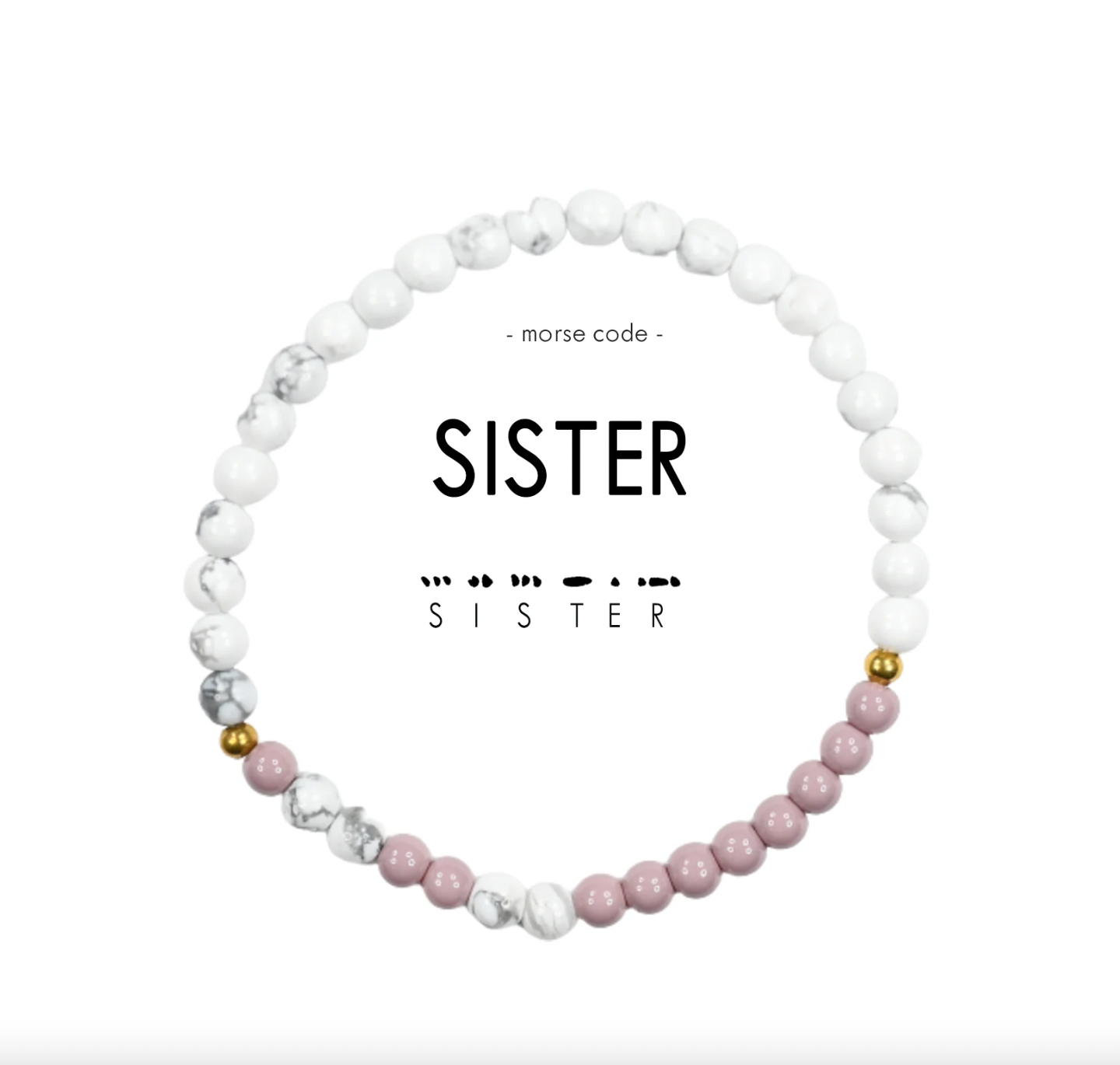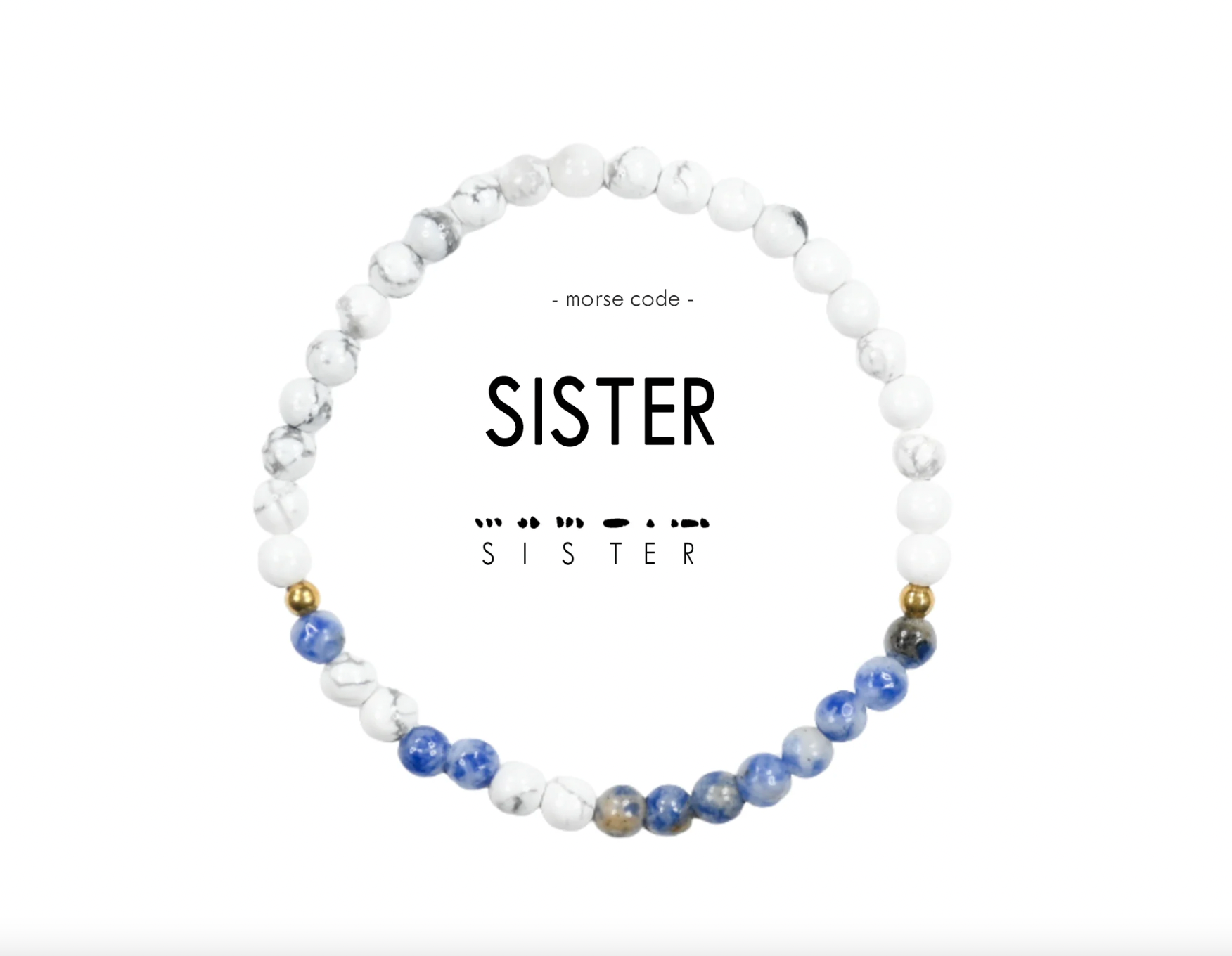 How to read your jewelry: A Morse Code dot is one bead and a dash is two beads in the alternating color. Start at the small gold spacer bead and follow the Morse Code spelling around the bracelet!
