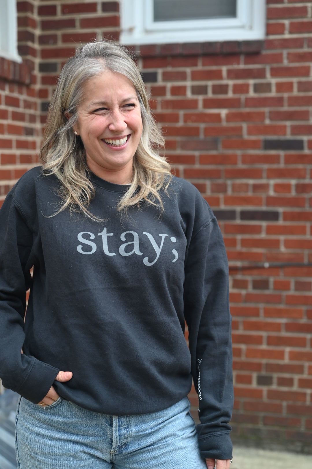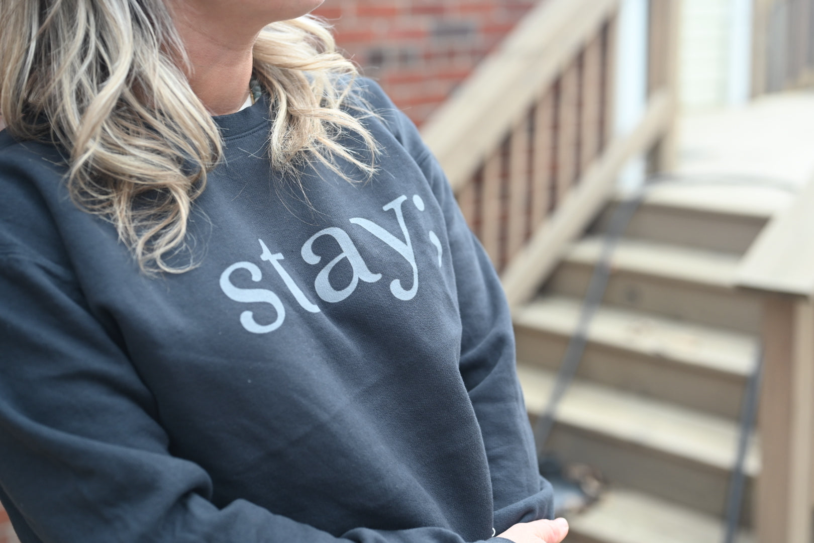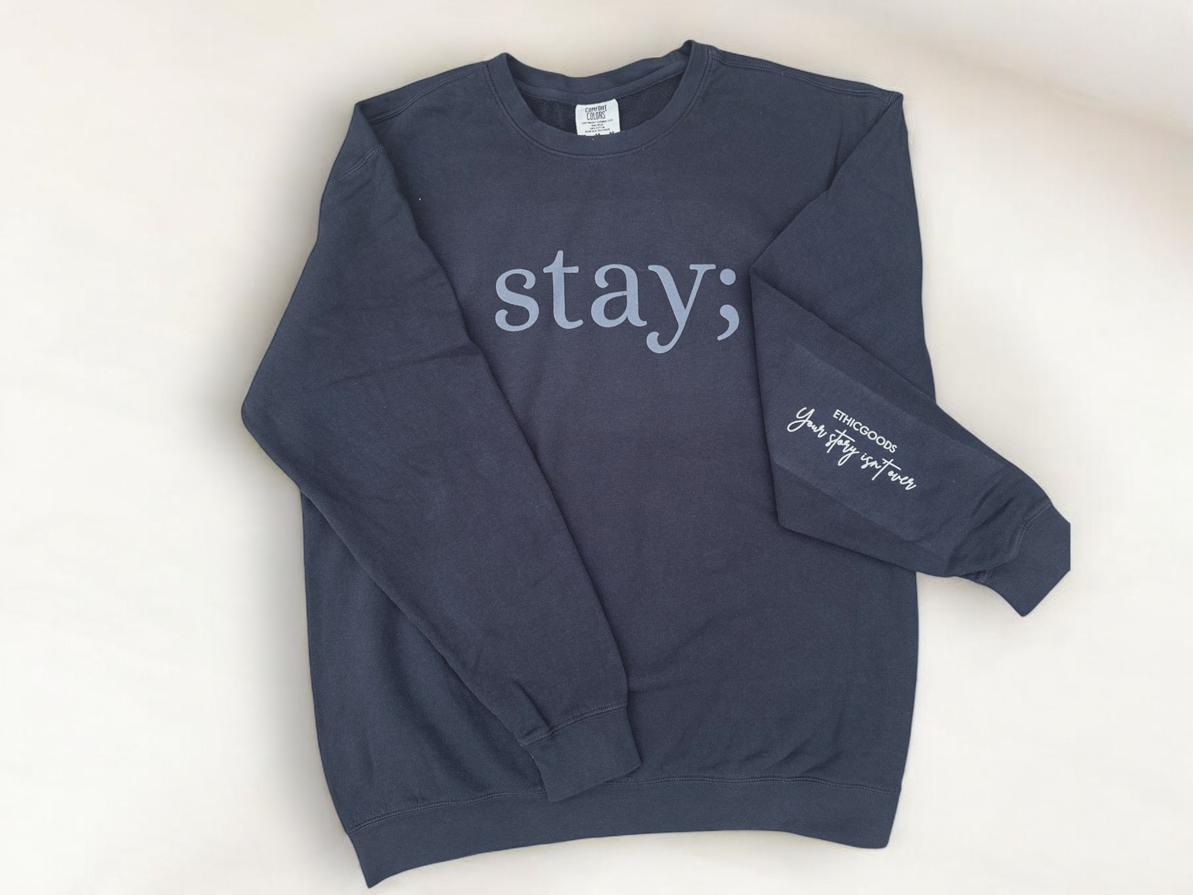 Our screen printed STAY Sweatshirt is created with love as a reminder that YOU are worthy and important. The sleeve says "Your Story Isn't Over" as a reminder of your inner strength! Made with 100% cotton from Comfort Colors, these sweatshirts may run a bit small, but they are incredibly soft and lightweight.