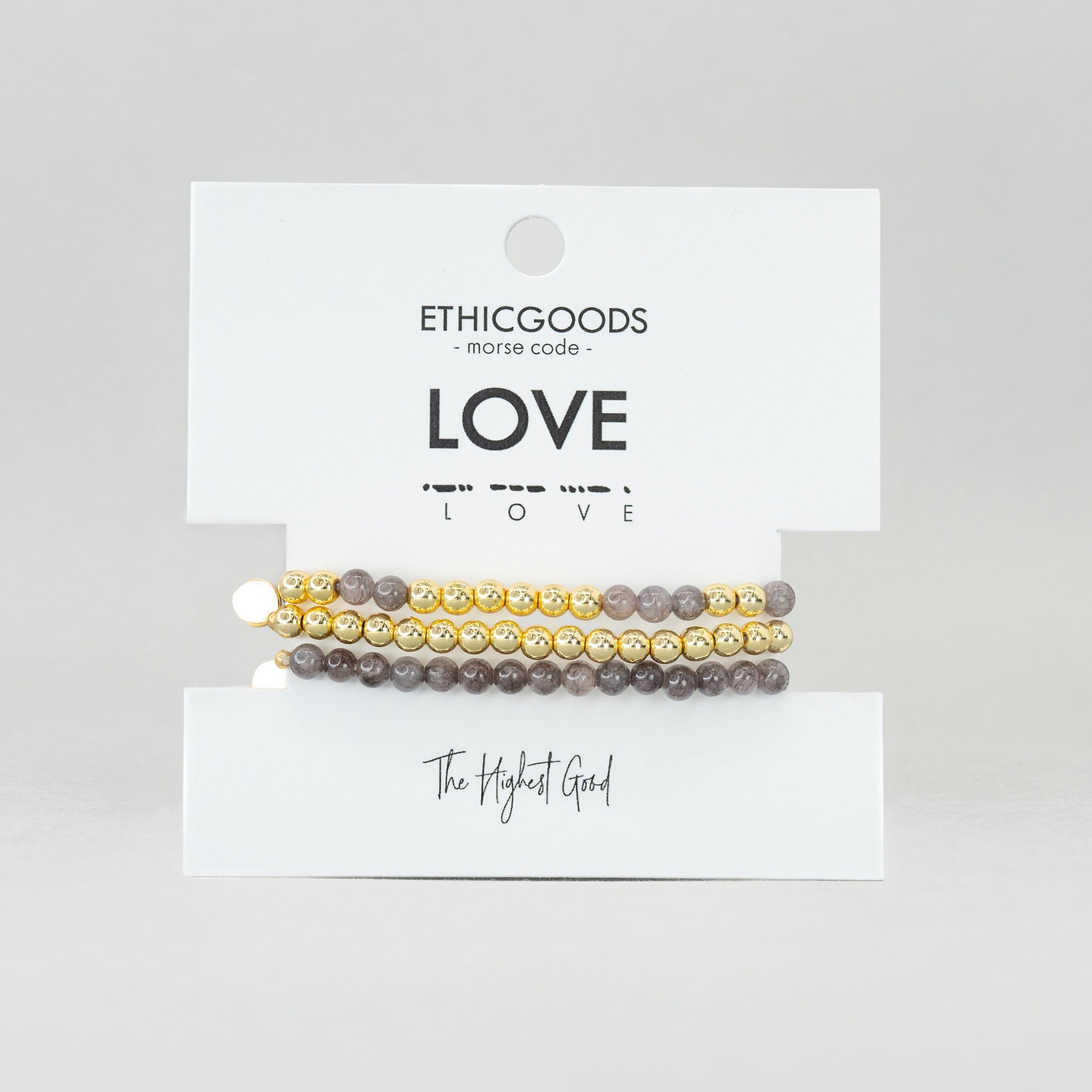 One LOVE Morse Code Bracelet, one gold hematite bracelet, one solid stone stacking bracelet. The perfect stacking set!