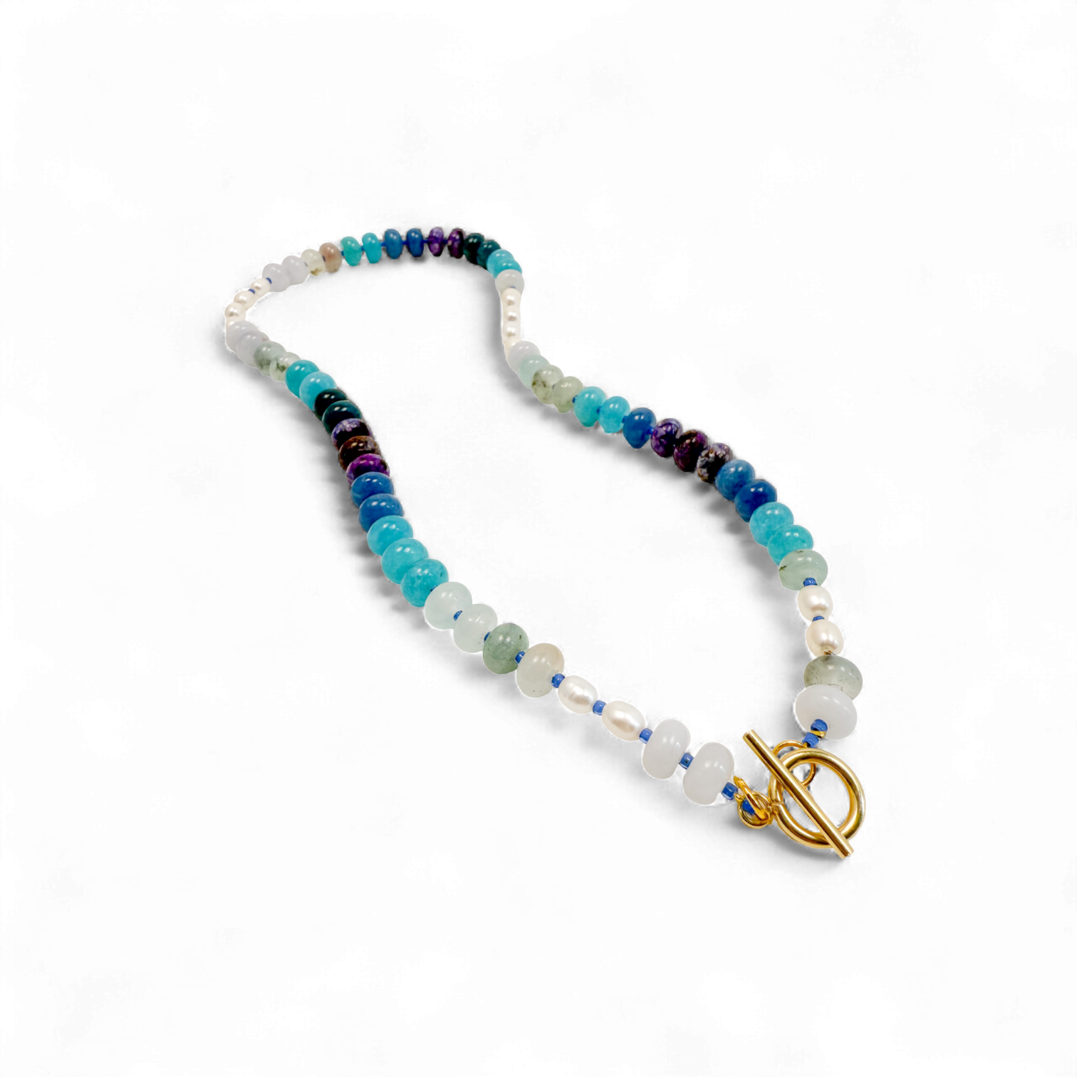 This necklace combines 8mm ocean-inspired gemstones with luminous freshwater pearls for a look that feels like sunlight on water. With soothing blues and creamy whites, it’s the perfect balance of structure and softness—refined, yet relaxed.