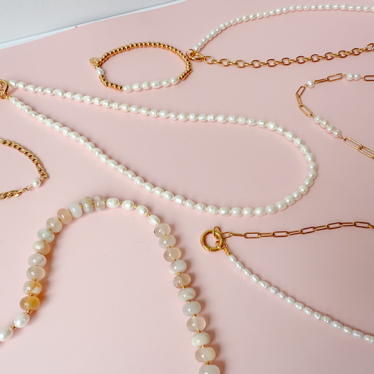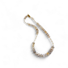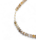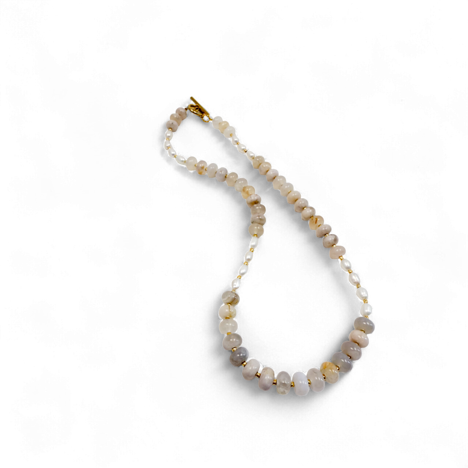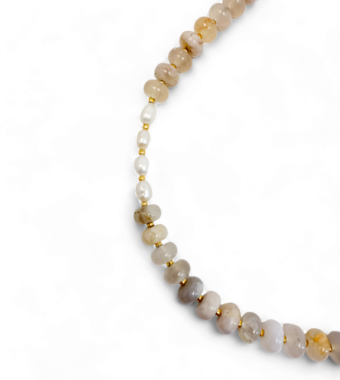 This necklace features a calming mix of neutral-toned agate gemstones and luminous freshwater pearls. The soft, natural palette evokes foggy mornings and quiet moments, offering both grounding and grace. It’s effortless, elegant, and full of depth.